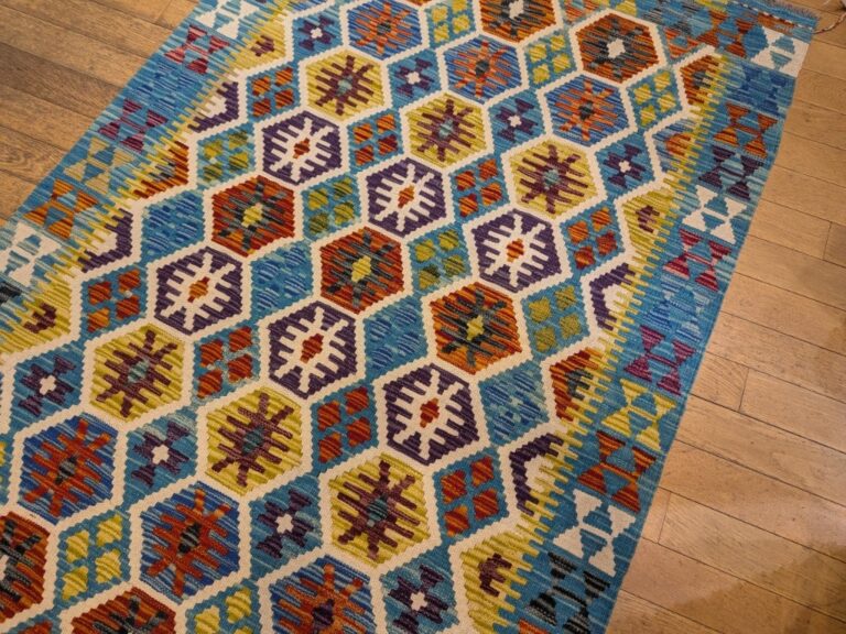 Les kilims se déclinent en une infinité de tons : des rouges profonds aux beiges doux, en passant par des bleus grisés ou des verts olive. Si vous souhaitez un intérieur chaleureux, orientez-vous vers des teintes chaudes. On va trouver souvent ces couleurs dans les kilims afghans traditionnels ou les kilims Gashgai.