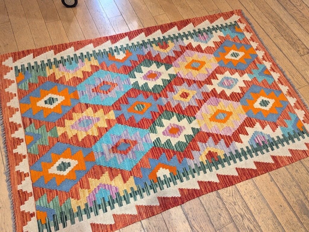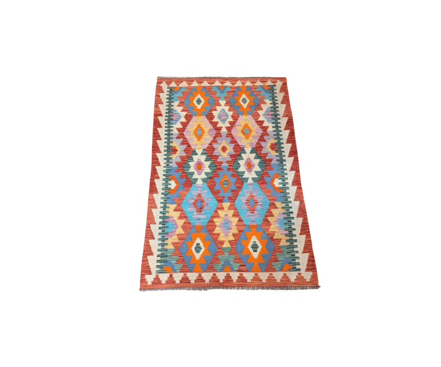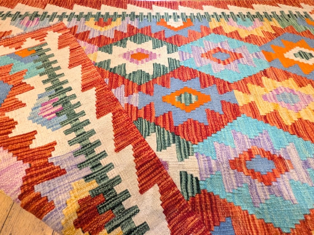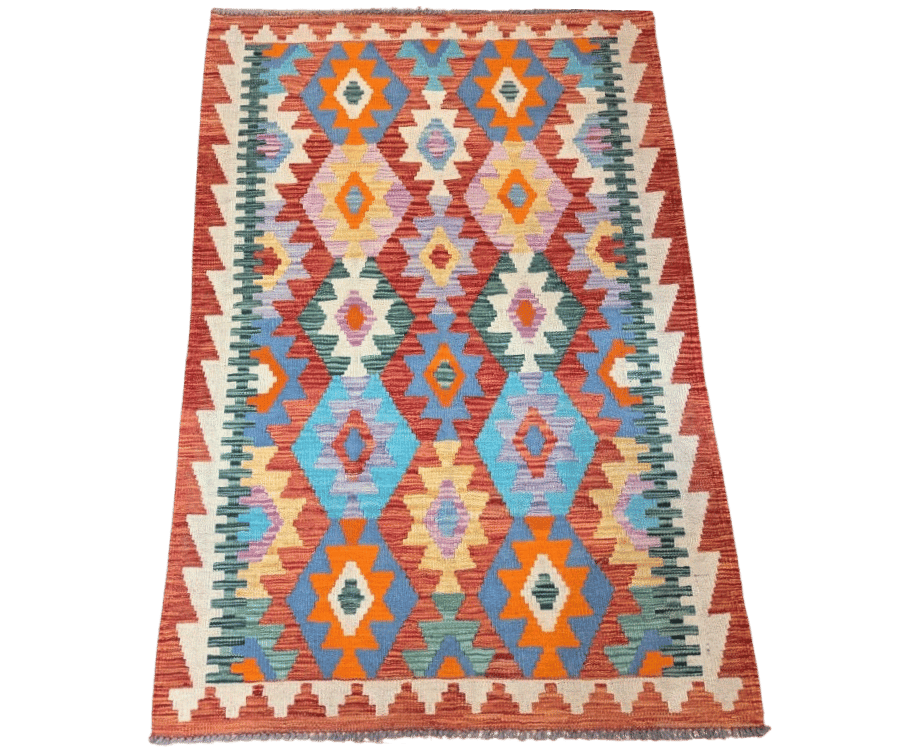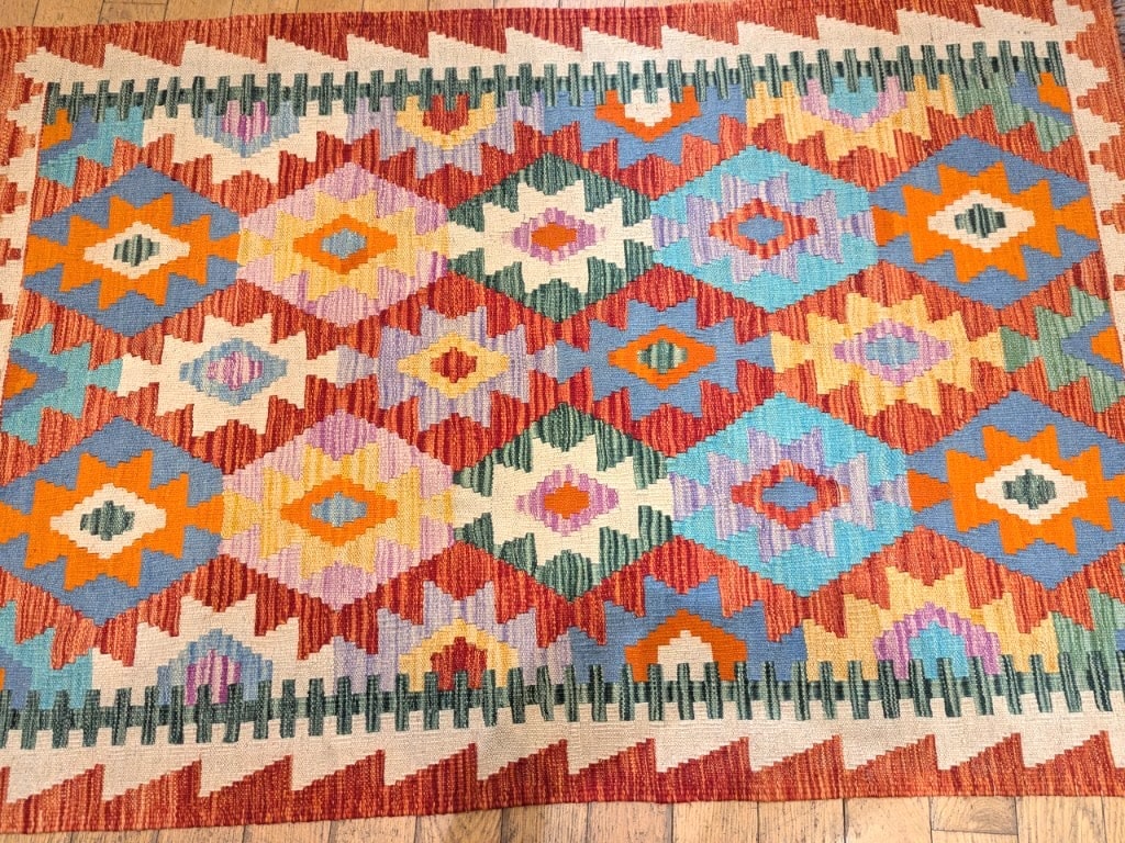 Ce tapis afghan offre un festival de formes et de couleurs avec son motif central en losanges éclatants et ses bordures stylisées. L’orange vif, le bleu ciel, le jaune et le rouge brique se répondent dans une mise en scène rythmée et joyeuse. Chaque losange affiche un cœur contrasté, accentuant le relief visuel de l’ensemble.