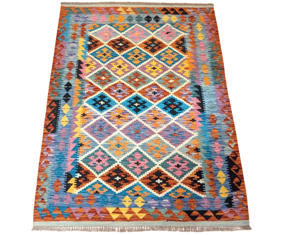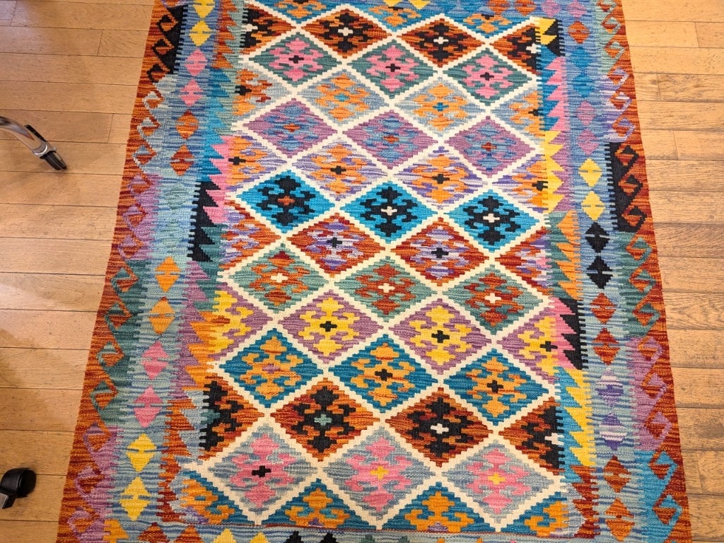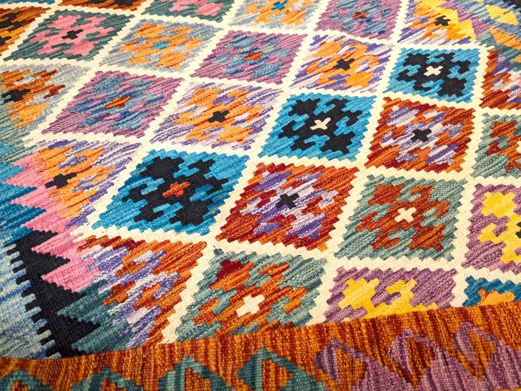 Ce tapis afghan se distingue par son exubérance visuelle et sa palette éclatante. Une succession de losanges vivement colorés structure le champ central, encadrée par des bordures aux motifs en pointe tout aussi intenses. Bleu vif, rose, jaune, noir et violet se mêlent dans une composition à la fois énergique et cohérente, typique du style kilim.