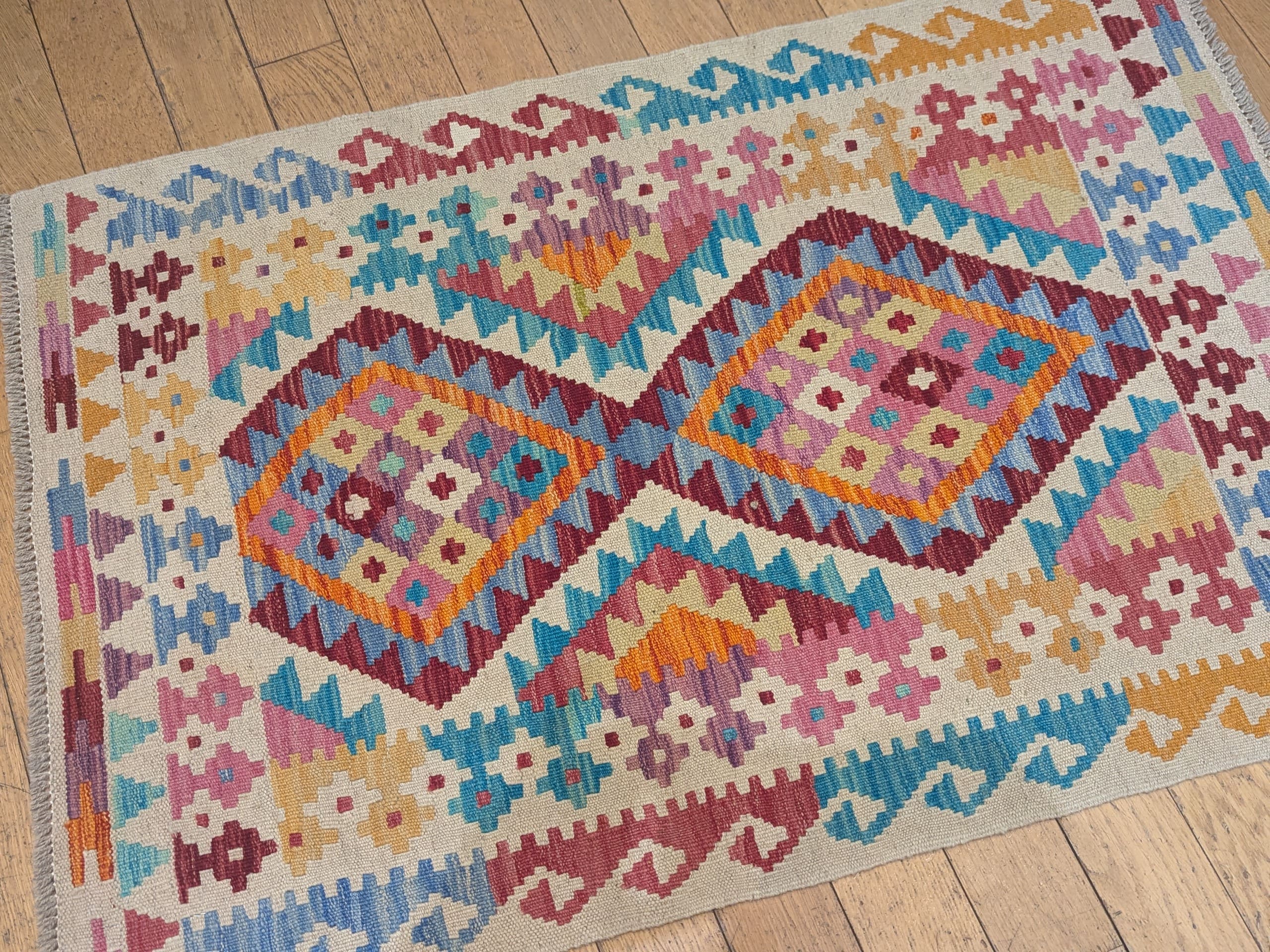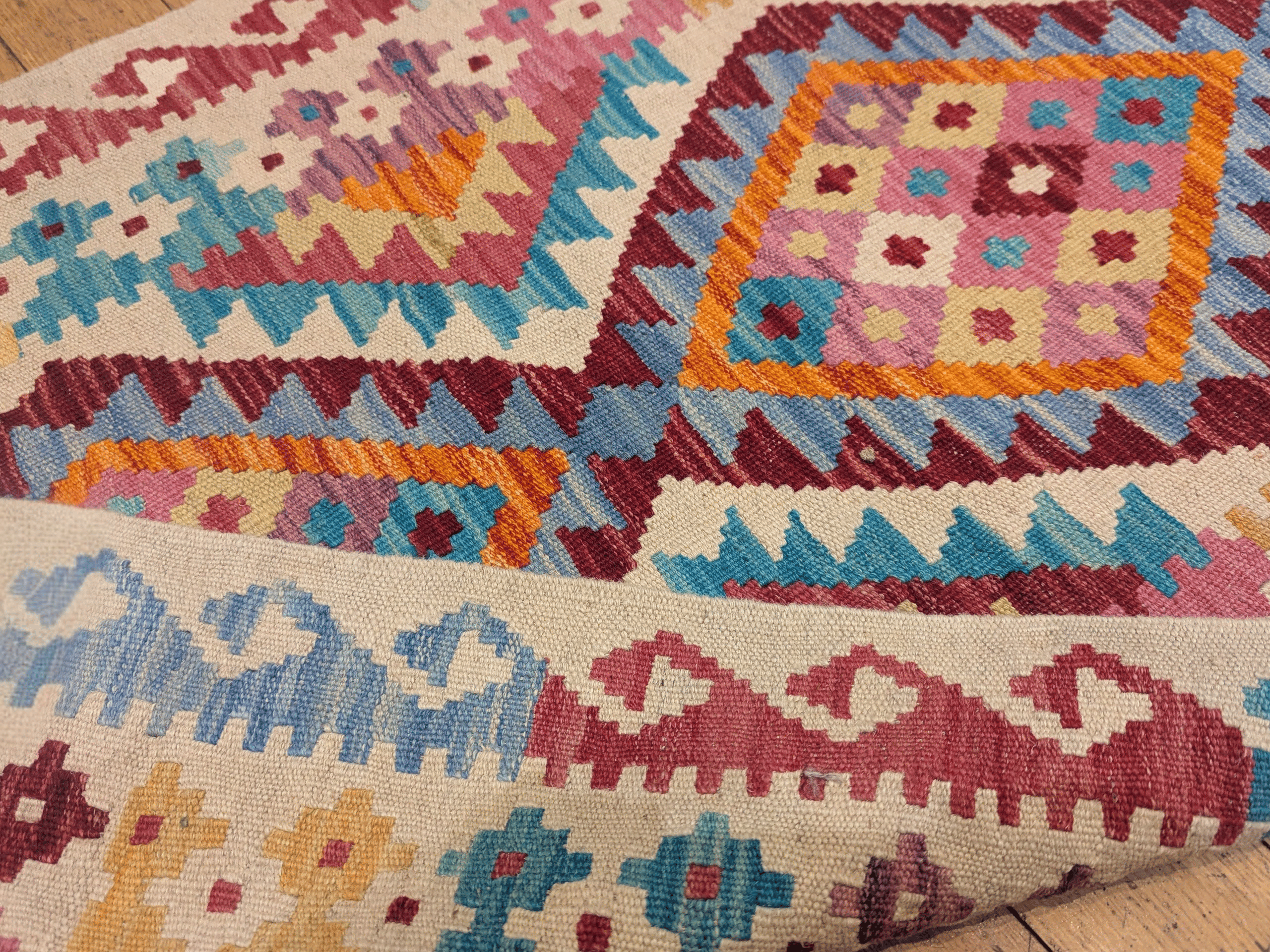 Les couleurs pastel, allant du bleu au rose en passant par le jaune et le bordeaux, s’expriment avec subtilité sur ce fond lumineux. Les motifs secondaires, finement répartis sur toute la surface, apportent du rythme sans alourdir la composition, créant un équilibre harmonieux entre structure et légèreté.