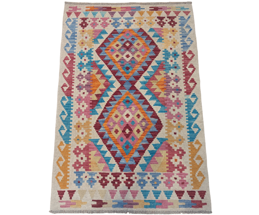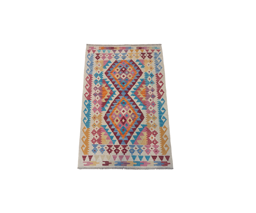 Ce tapis Asma se distingue par un fond beige clair, qui occupe la majorité du champ et apporte une grande luminosité à l’ensemble. Cette base douce et neutre met en valeur une composition riche de motifs géométriques, organisés autour de deux grands médaillons losangés.