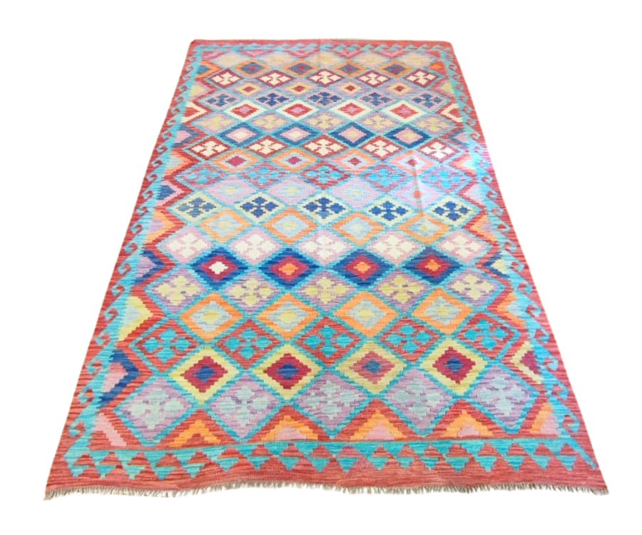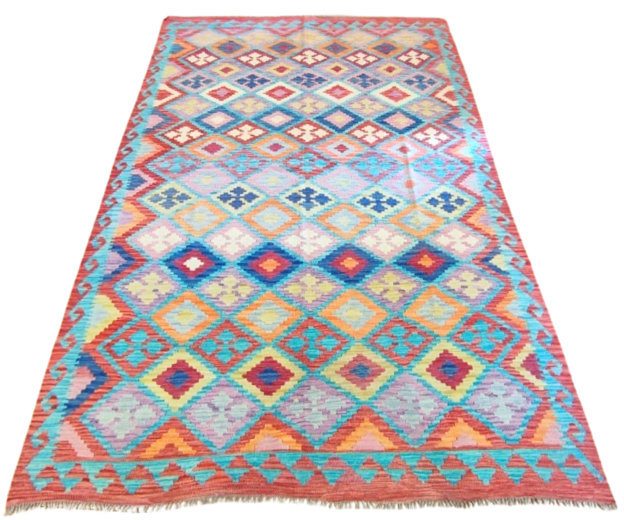 Le Kilim Asma – Ezvan est un tapis tissé à la main au cœur de l’Afghanistan, fruit d’un savoir-faire ancestral. Son motif géométrique en losanges et sa palette multicolore audacieuse en font une pièce joyeuse et pleine de vitalité. Le contraste entre ses teintes vives — bleu, turquoise, orange, blanc, brique et rose — et son fond plus clair apporte rythme et légèreté à tout espace de vie.
