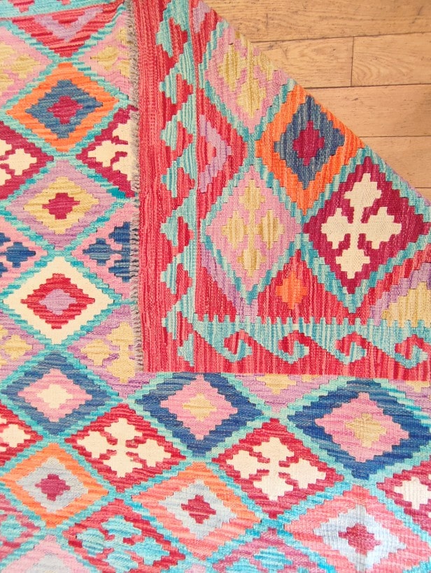 Un tissage artisanal traditionnel : chaque kilim est unique, reflet du geste précis et de la créativité des tisserandes afghanes.