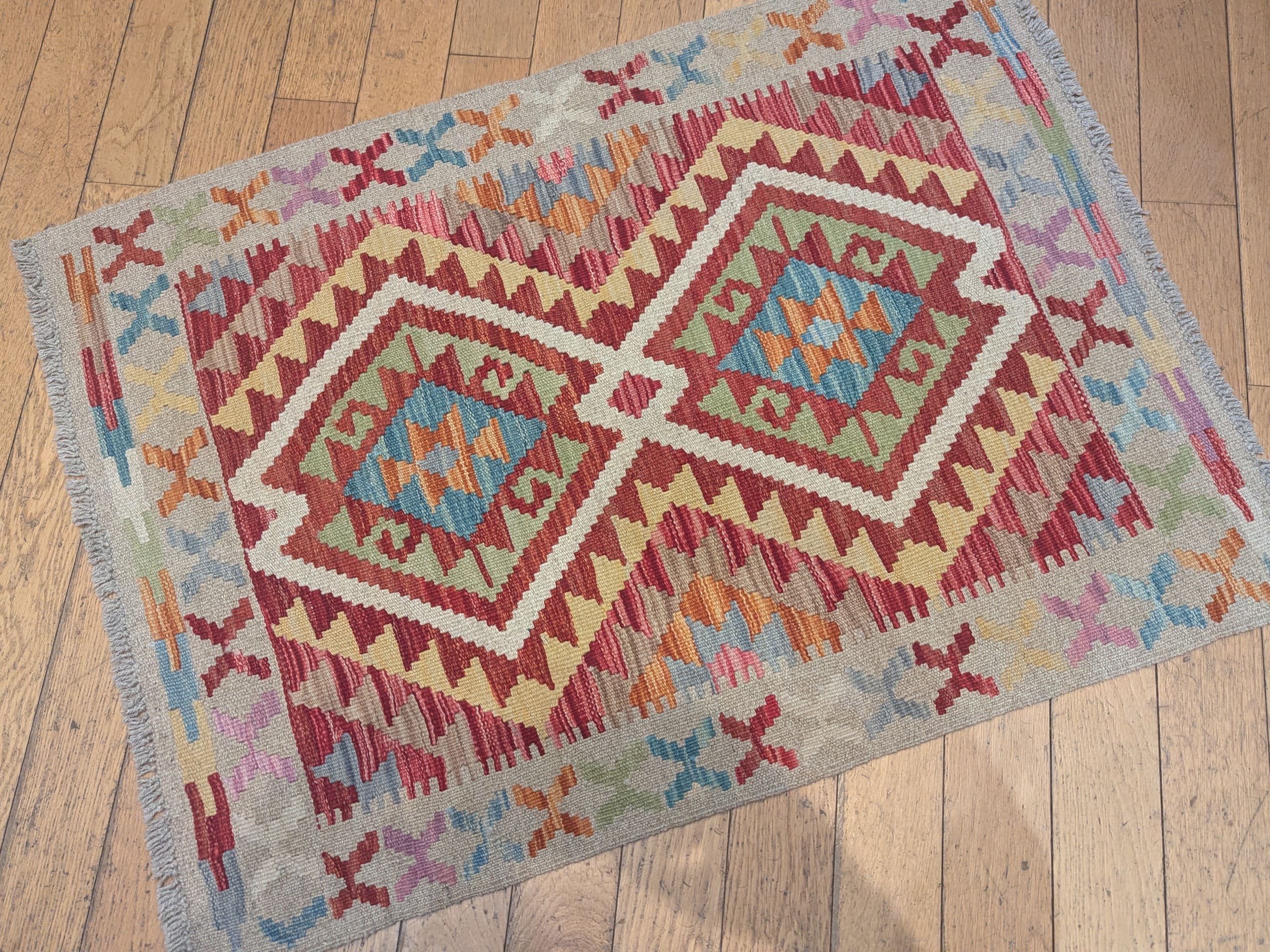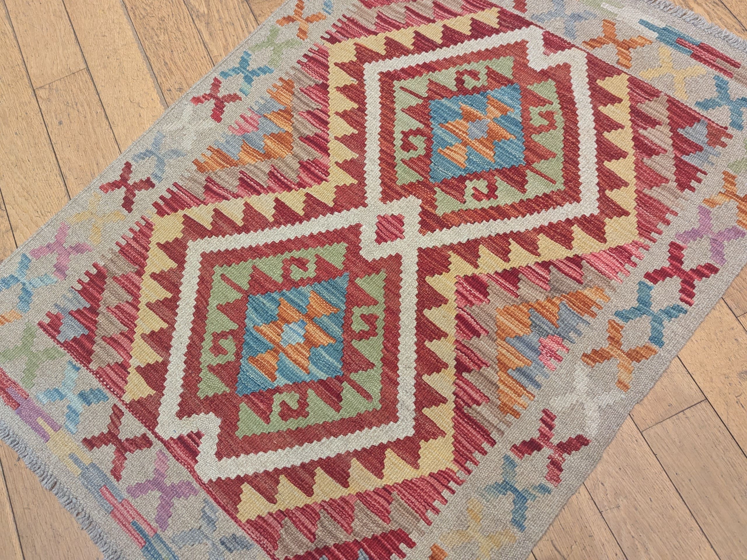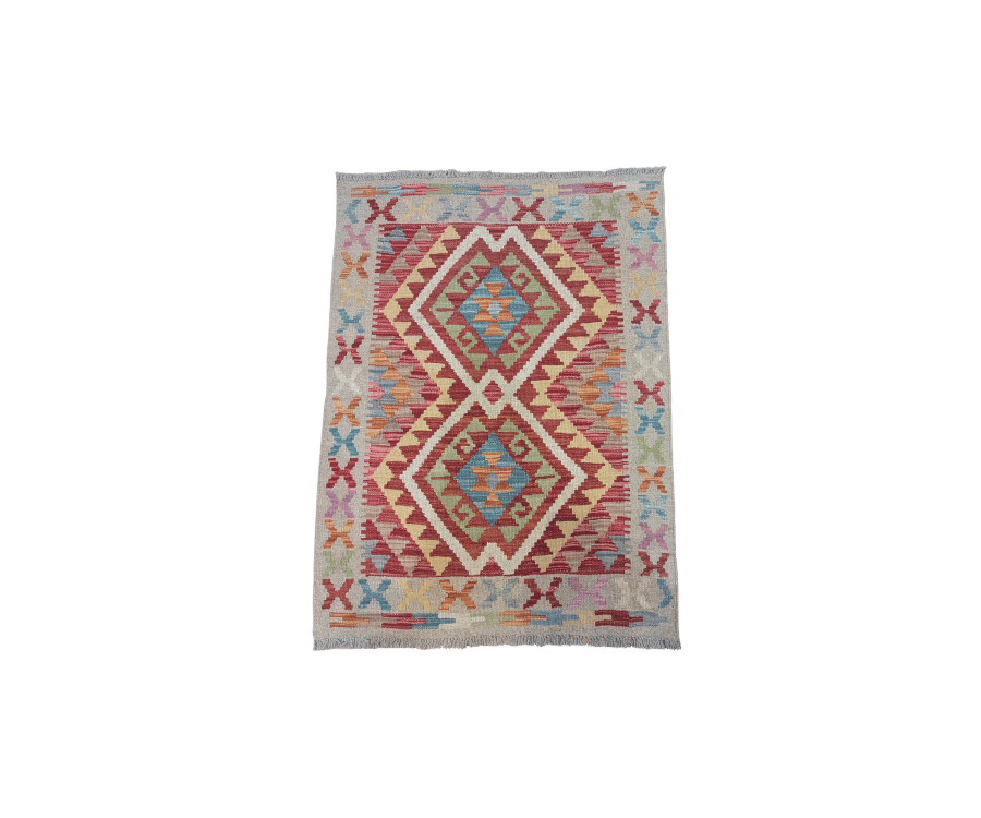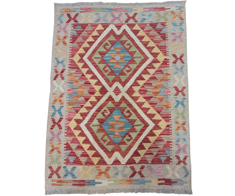 Ce kilim Afghane de la collection Asma présente un fond beige légèrement grisé, qui sert de base douce et équilibrée à une composition centrale plus intense. Le champ est structuré autour de deux grands médaillons géométriques imbriqués, aux teintes rouges, bleues et vertes, entourés de motifs stylisés typiques de l’art tribal. L’ensemble crée un contraste harmonieux entre un fond apaisant et des motifs plus dynamiques.