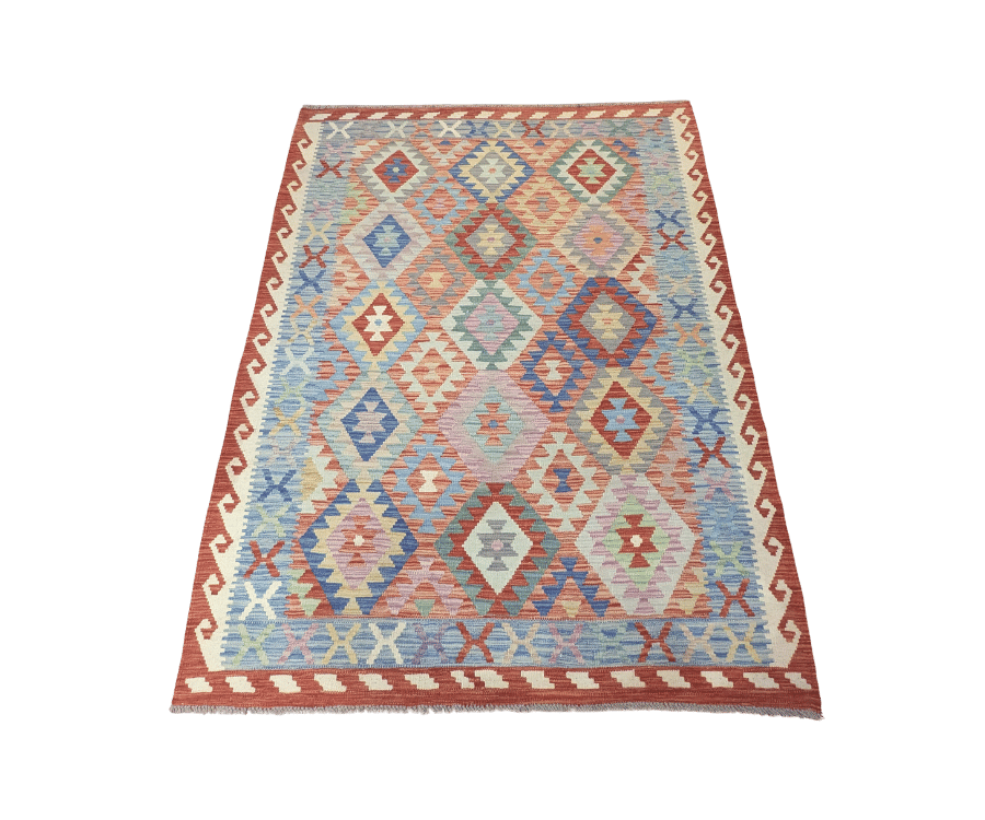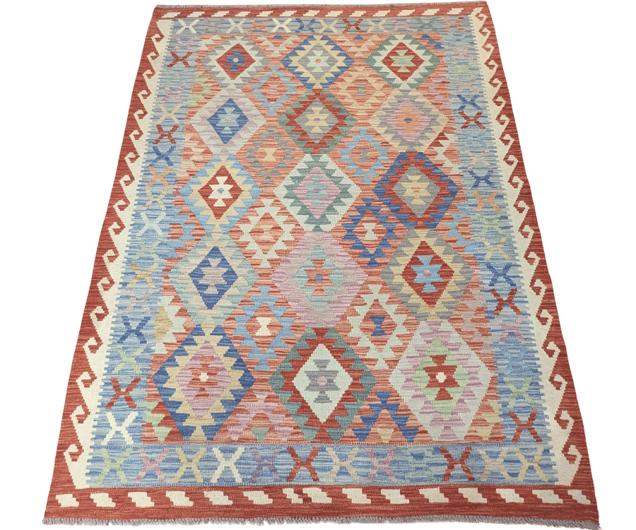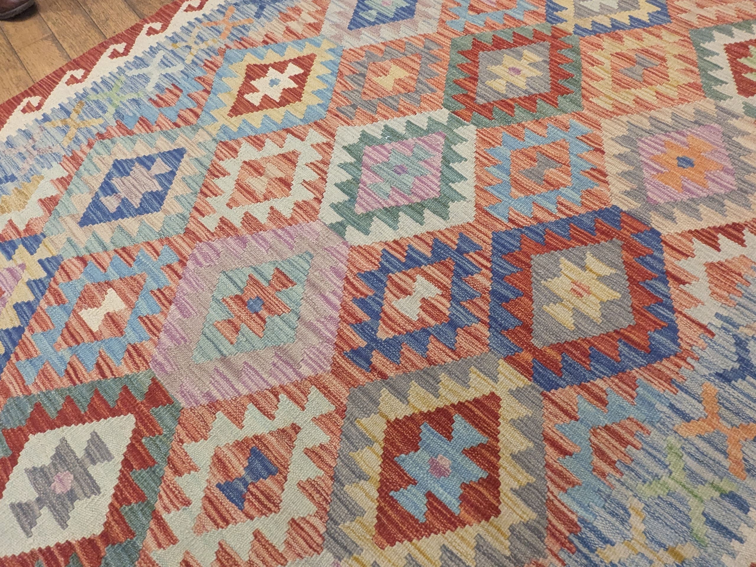 Ce kilim de la collection Asma se distingue par son fond bleu clair, doux et lumineux, qui structure l’ensemble du tapis et lui confère une grande fraîcheur visuelle. Ce champ pastel met en valeur une composition dense de motifs losangés multicolores, organisés de manière rythmée sur toute la surface. Les nuances de rouge, beige, vert et violet viennent enrichir l’ensemble avec subtilité, créant un équilibre harmonieux entre dynamisme et douceur.