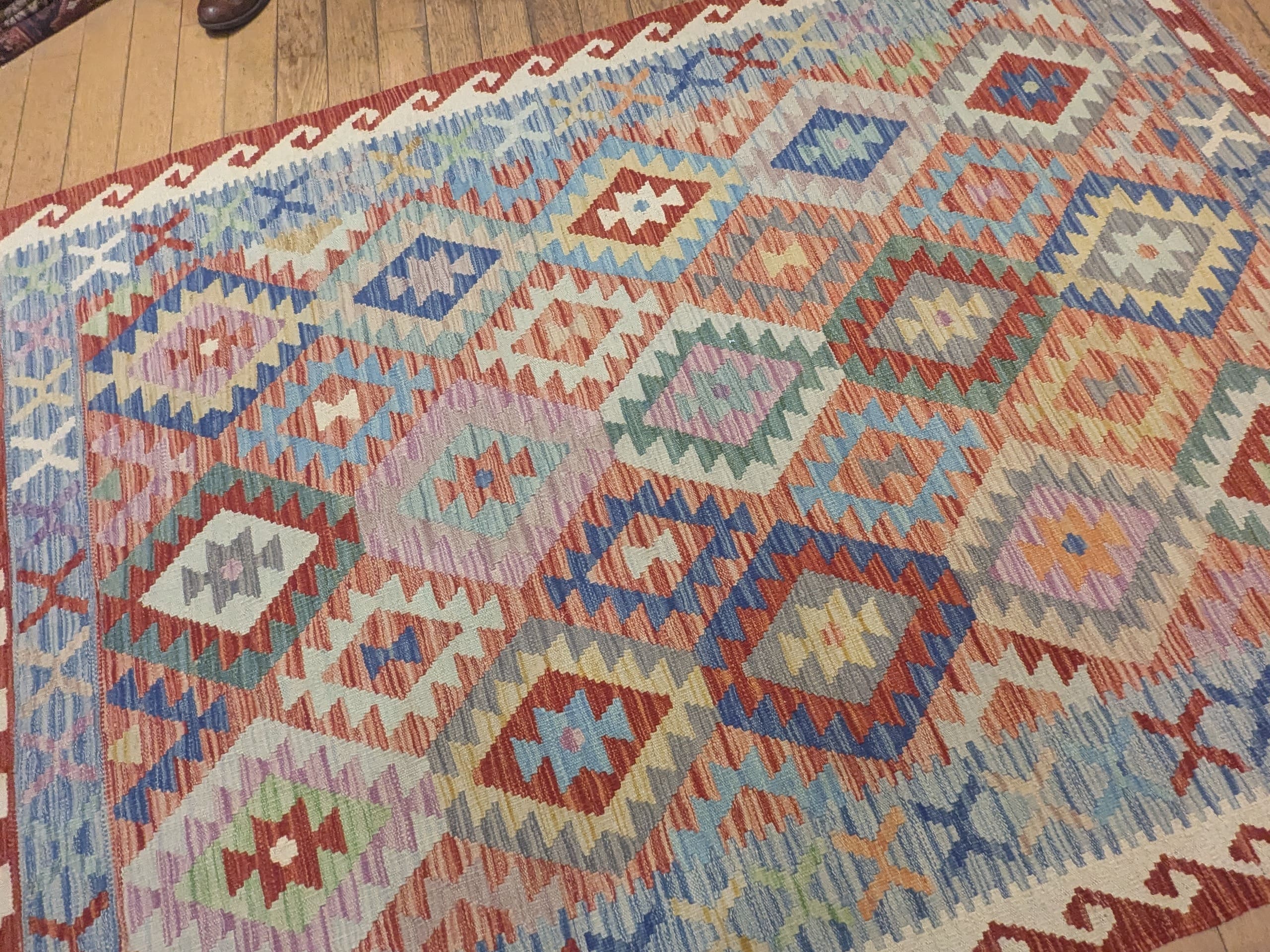 Tissé à la main selon les traditions afghanes, ce kilim reflète un savoir-faire artisanal précis, où chaque motif s’intègre dans une composition globale cohérente. Son grand format en fait une pièce idéale pour structurer un espace de vie tout en apportant lumière et caractère.