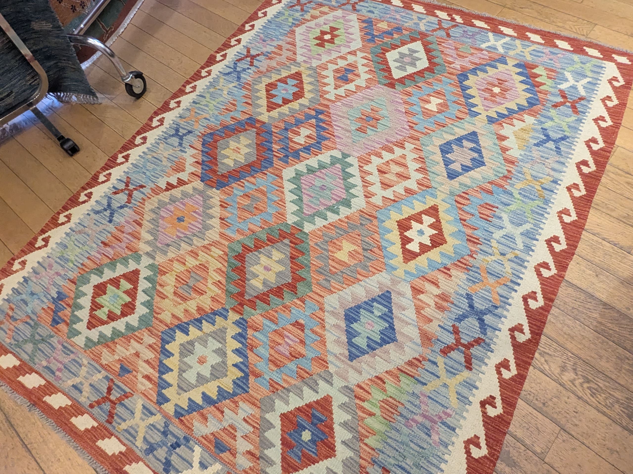 Ce kilim est une pièce harmonieuse et lumineuse, idéale pour apporter une touche artisanale tout en finesse dans un intérieur élégant.