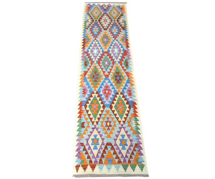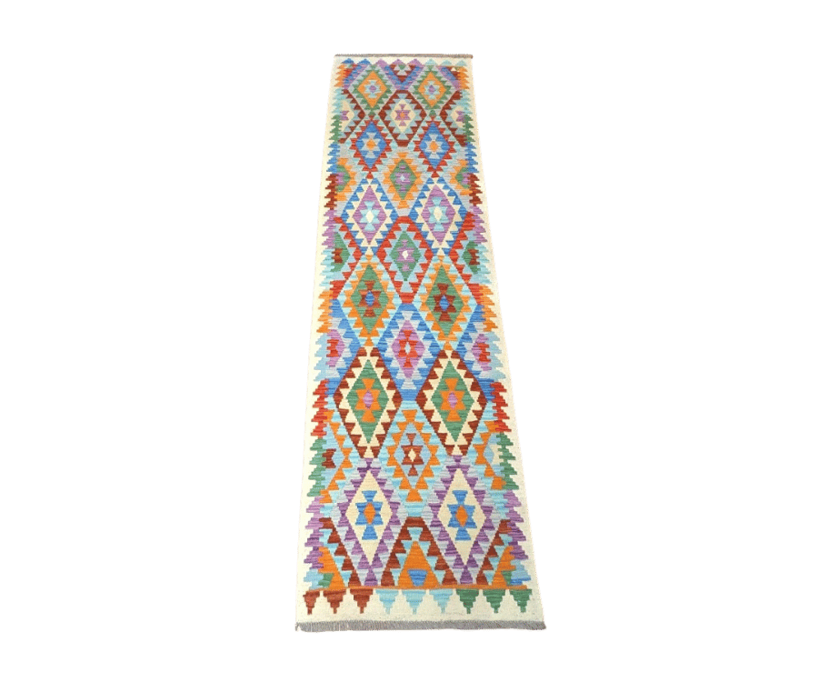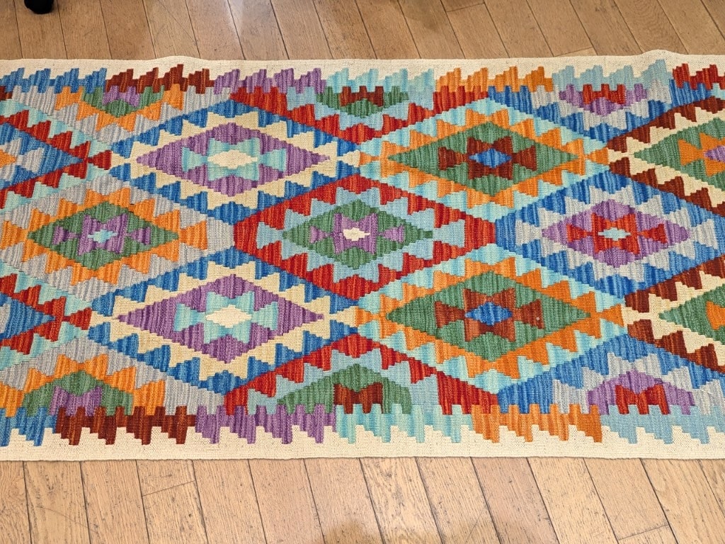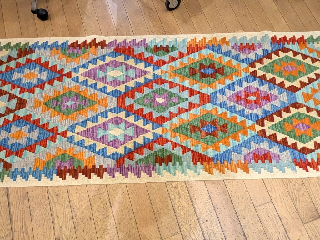 Ce kilim Asma d’Afghanistan séduit par son fond beige lumineux qui met en valeur une succession de grands losanges colorés. Les teintes de bleu, orange, vert et violet s’entrelacent dans une composition géométrique rythmée, typique des kilims afghans traditionnels. L’ensemble est à la fois structuré et plein d’énergie.