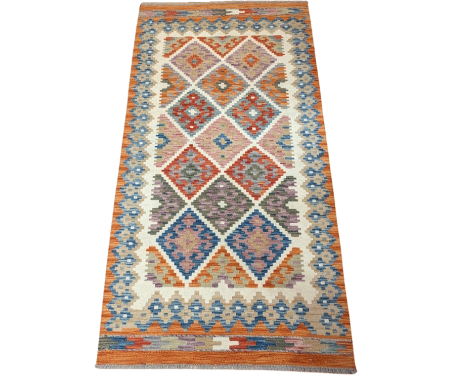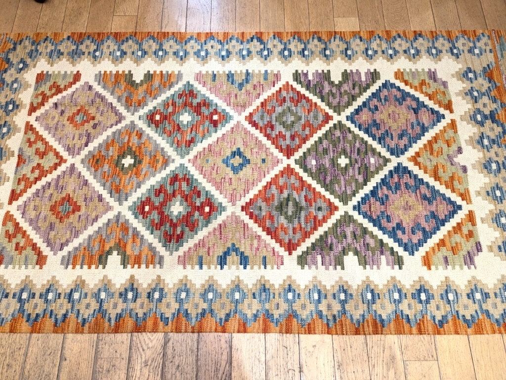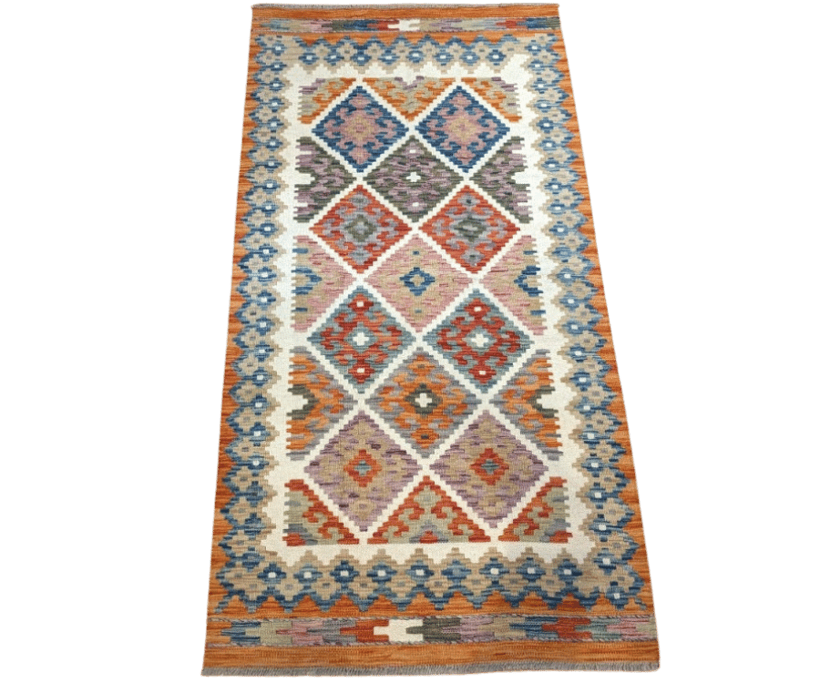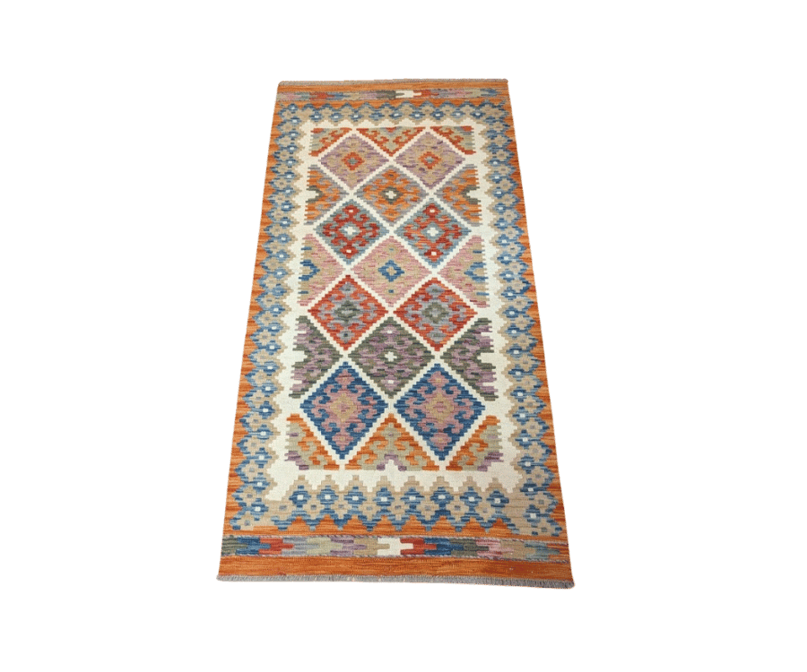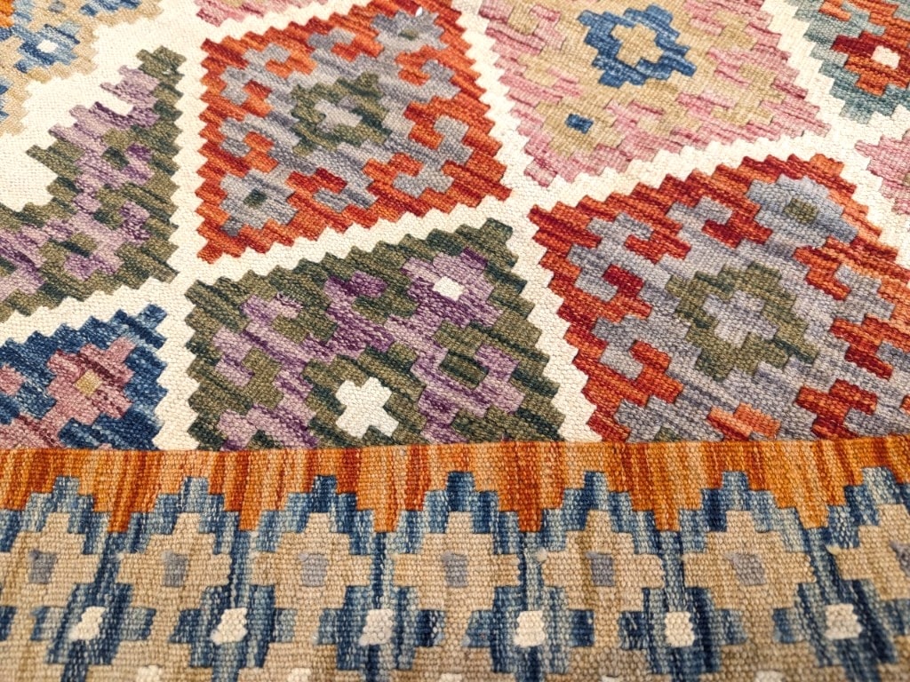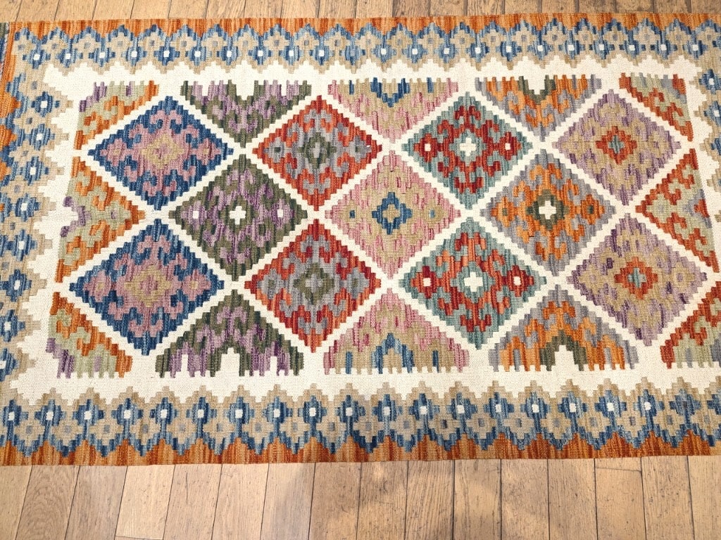 Ce tapis afghan artisanal attire immédiatement l’œil avec son agencement audacieux de losanges colorés et ses contrastes vifs. Chaque motif semble raconter une histoire, portée par des teintes intenses de rouge, violet, bleu et orange, harmonieusement encadrées par une bordure géométrique travaillée. Une pièce vibrante, qui célèbre le savoir-faire traditionnel tout en affichant un caractère contemporain.