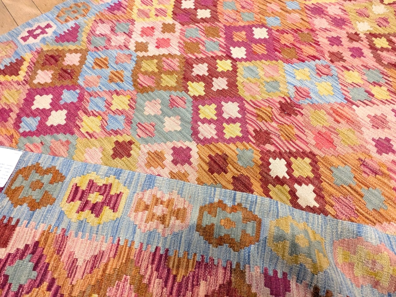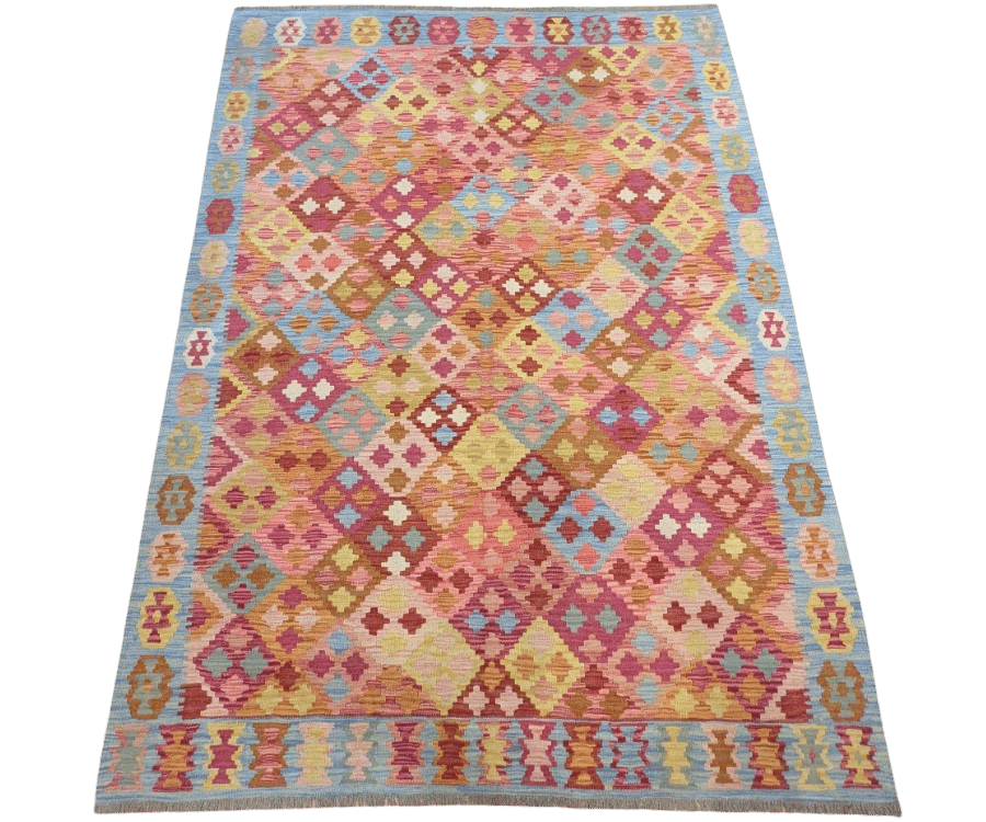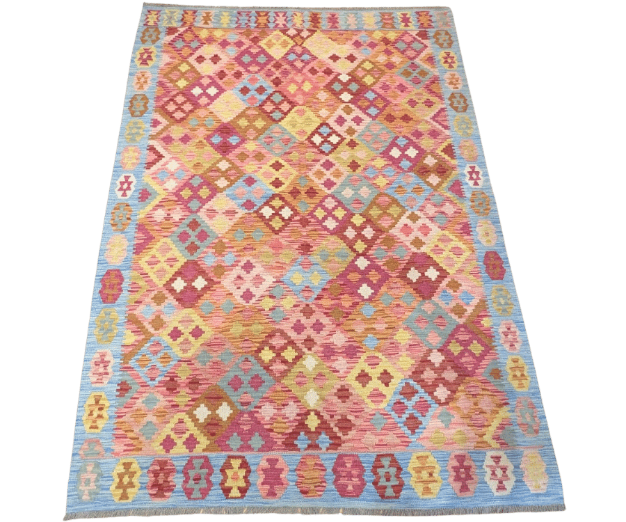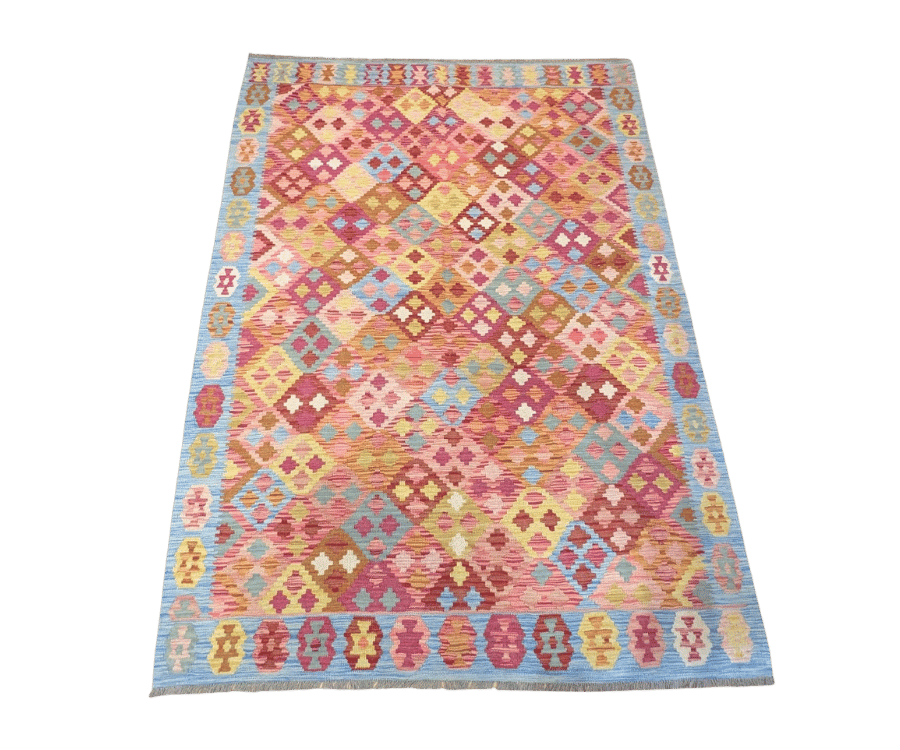 Ce kilim afghan de la collection Asma illumine immédiatement l’espace par sa teinte dominante rose et ses motifs losanges colorés. Noué à la main selon les traditions artisanales d’Afghanistan, il se distingue par son jeu de carrés géométriques qui offrent une richesse visuelle pleine de rythme et de douceur.