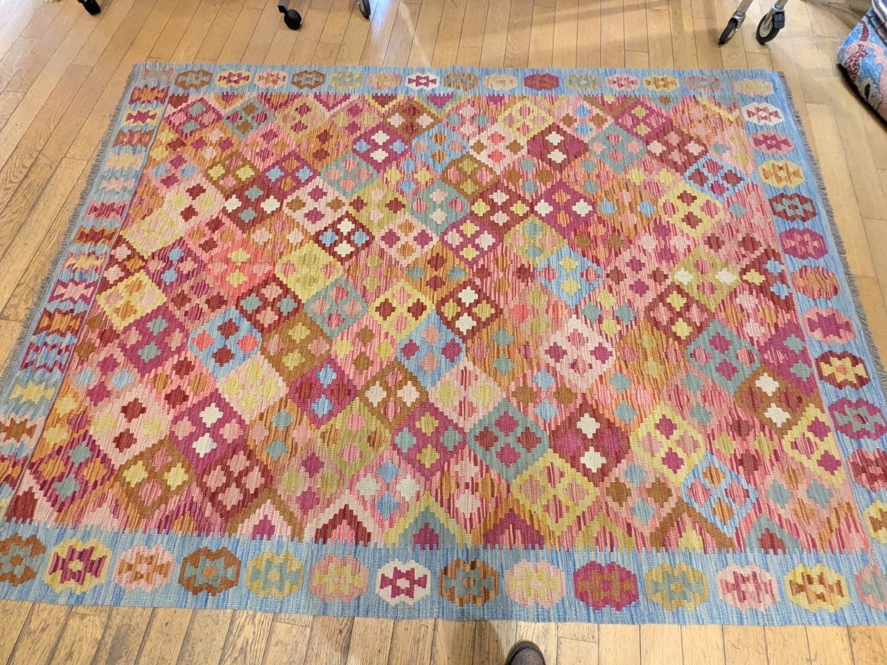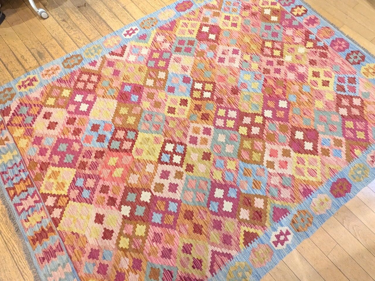 Une composition graphique unique : Ses losanges multicolores créent une dynamique joyeuse sans rompre l’harmonie générale du tapis.