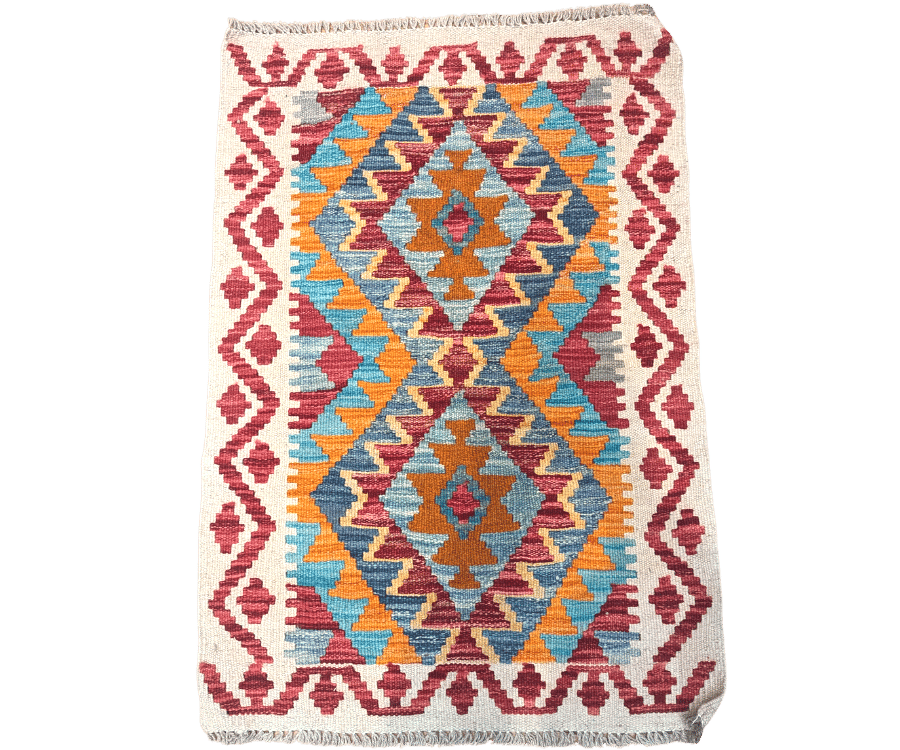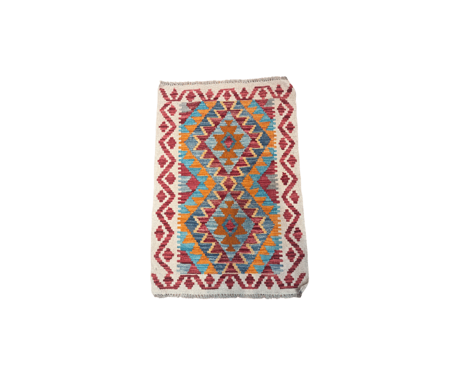 Ce kilim afghan issu de la collection Asma séduit par son équilibre visuel et ses contrastes dynamiques. Son fond beige lumineux met en valeur une composition riche de motifs géométriques, structurés autour de deux grands médaillons losangés. Les teintes chaudes de rouge, d’orange et de bleu viennent rythmer l’ensemble avec énergie, tout en conservant une belle harmonie. Tissé à la main selon un savoir-faire traditionnel, ce kilim apporte une touche authentique et vivante à votre intérieur.