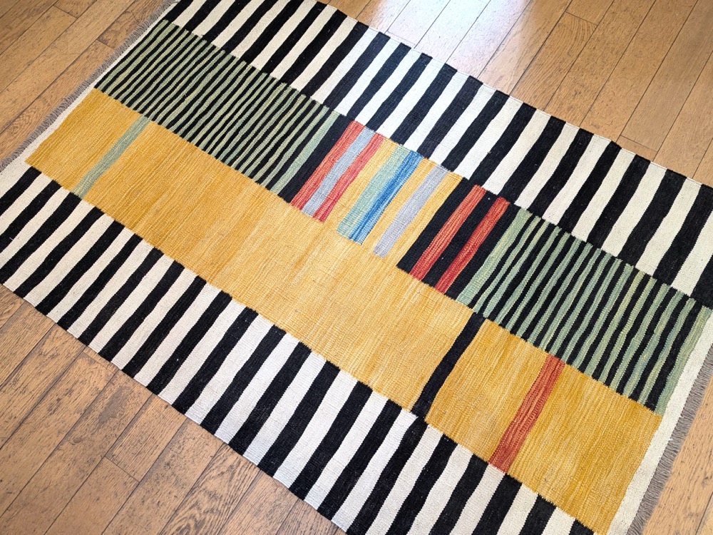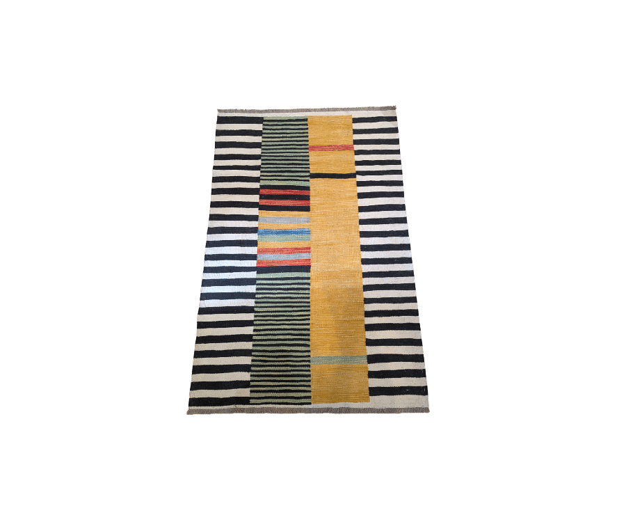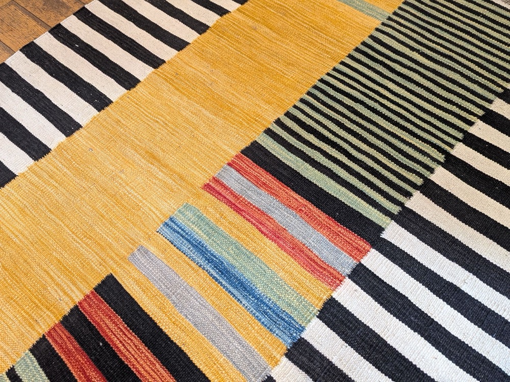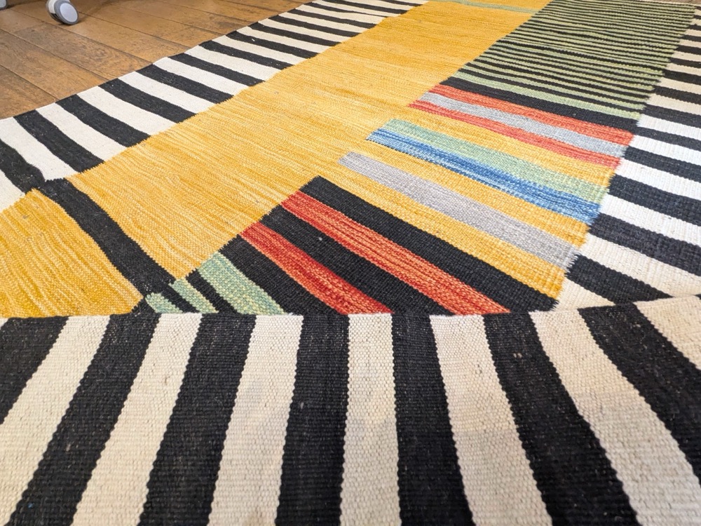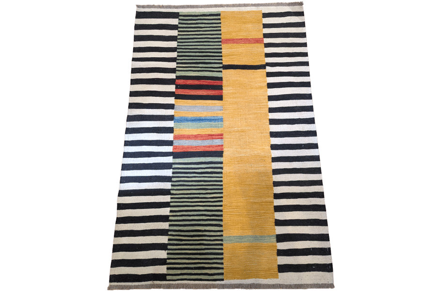 Ce kilim de la collection Mezara, tissé à la main en Afghanistan, se distingue par son design graphique audacieux et sa palette de couleurs vibrantes. Son fond jaune lumineux structure l’ensemble et met en valeur un jeu de rayures contrastées, mêlant noir et blanc ainsi que des touches subtiles de vert, rouge et bleu. L’alternance des bandes crée un rythme visuel dynamique, tout en conservant une belle harmonie d’ensemble.