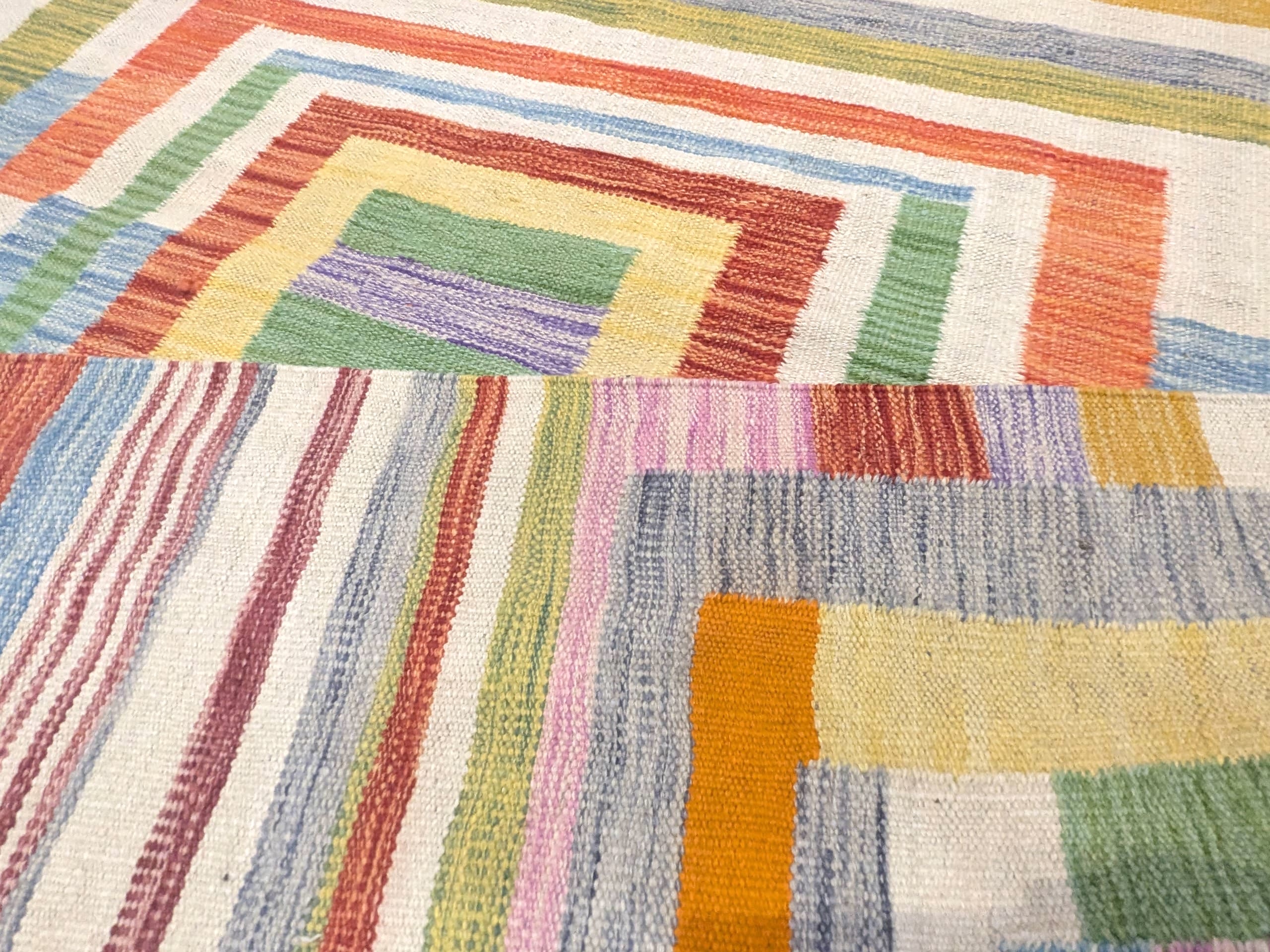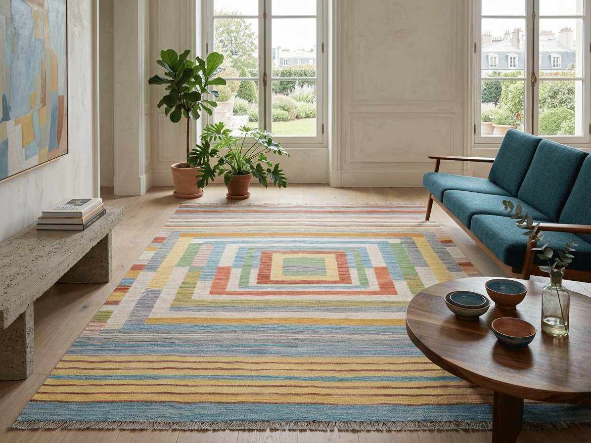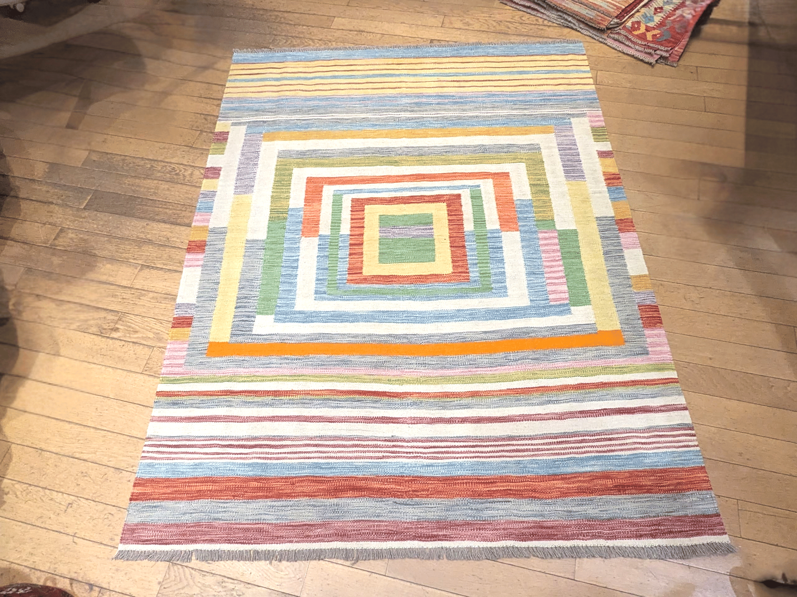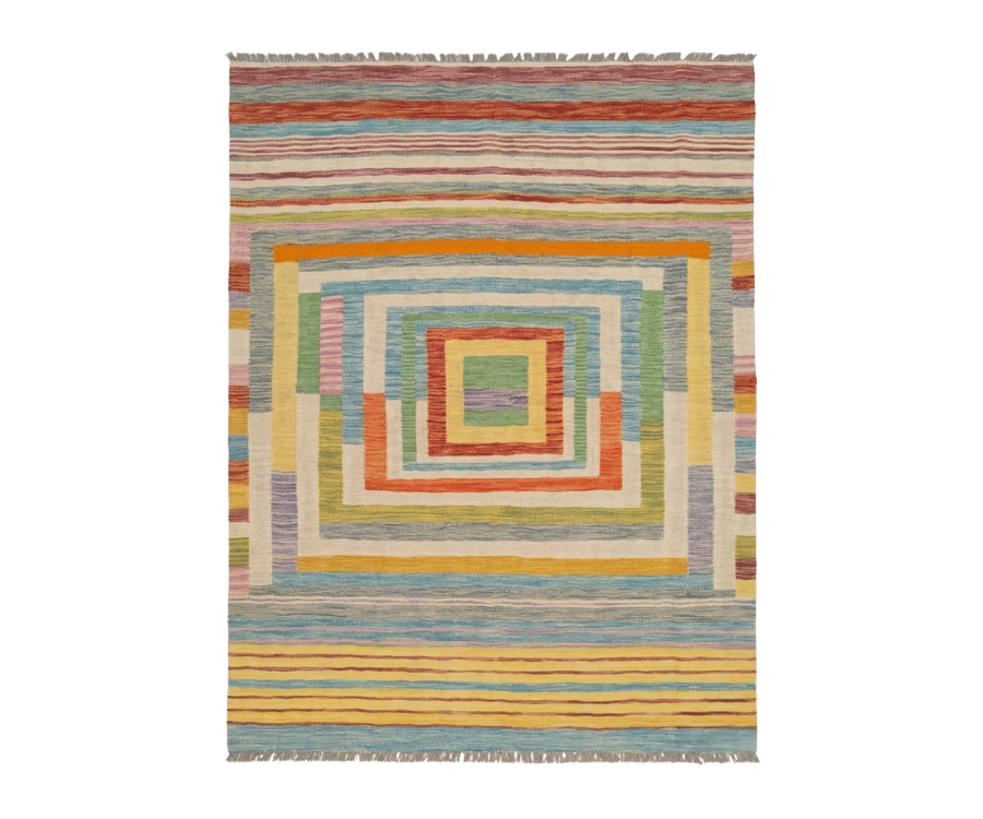 Le centre du tapis est structuré par une succession de carrés imbriqués, formant un motif graphique qui attire le regard sans jamais être trop marqué. Autour de ce cœur géométrique, des bandes rayées viennent encadrer l’ensemble, apportant du rythme et renforçant l’aspect contemporain du design.