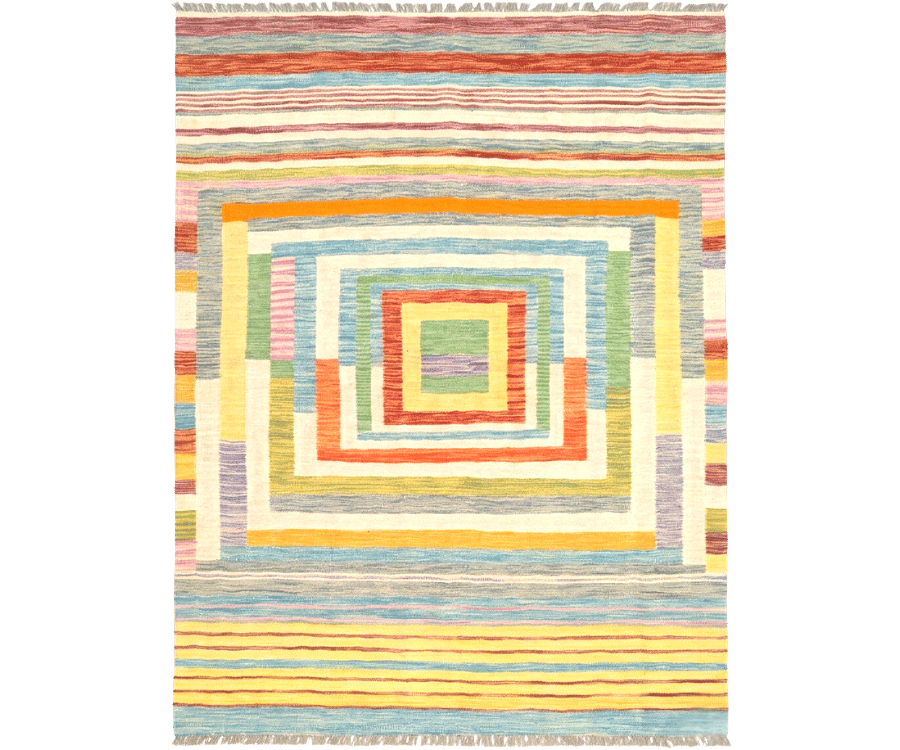 Ce tapis Mezara se distingue par un fond beige lumineux qui met en valeur une composition multicolore subtile et parfaitement équilibrée. Les teintes pastel de jaune, vert, bleu, rose et orange s’organisent autour d’un jeu de formes géométriques concentriques, créant une dynamique visuelle douce et harmonieuse.