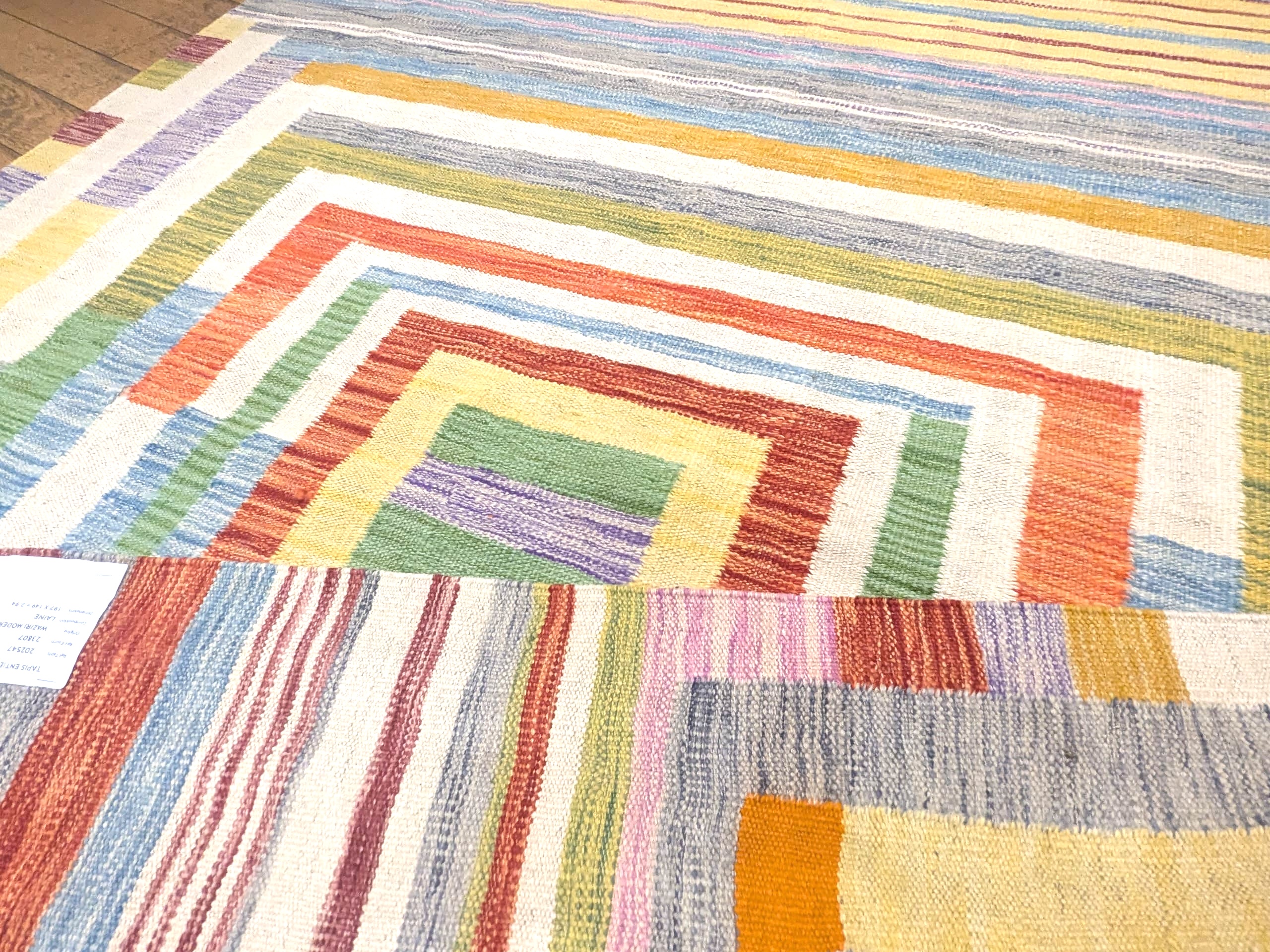 Les variations de textures et les transitions légèrement irrégulières entre les couleurs témoignent du travail artisanal, donnant au tapis un aspect vivant et authentique. L’ensemble reste léger et aérien grâce à la dominance de tons clairs.