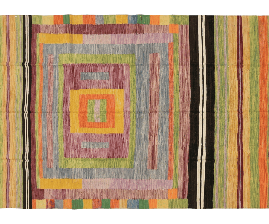 Ce kilim afghan de la collection Mezara se distingue par une composition riche et nuancée, mêlant carrés concentriques et bandes rayées en périphérie. Son design structuré est adouci par des transitions de couleurs légèrement floutées, donnant au tapis un aspect vivant et presque pictural. Les teintes de vert, de violet, d’orange et de jaune s’entrelacent harmonieusement, créant une palette vibrante mais équilibrée.