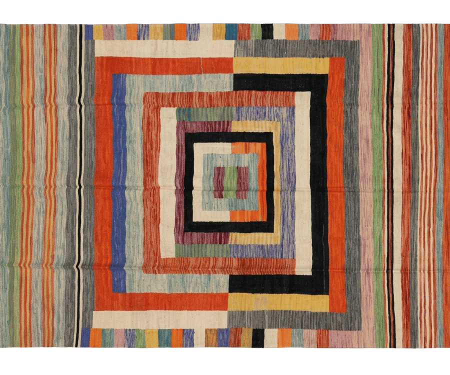 Ce kilim afghan de la collection Mezara se distingue par une composition graphique audacieuse et parfaitement maîtrisée. Son jeu de carrés concentriques, rythmé par des bandes colorées, crée un effet visuel captivant et structurant. Les nuances d’orange dominantes, associées à des touches de noir, de bleu, de vert et de beige, insufflent une énergie chaleureuse tout en conservant une belle harmonie d’ensemble. Tissé à la main selon les techniques traditionnelles, ce kilim allie modernité visuelle et authenticité artisanale.