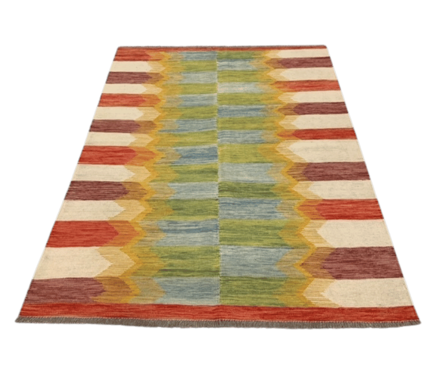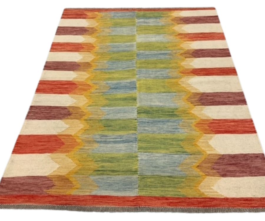 Ce kilim de la collection Mezara, tissé à la main en Afghanistan, se distingue par ses couleurs vives et son motif graphique très structuré. Le fond est rythmé par des bandes bleues et vertes aux reflets doux, encadrées de formes en zigzag dans des tons rouges, jaunes et orangés. Cette composition dynamique donne au tapis une personnalité forte et contemporaine, tout en conservant un ancrage artisanal profond.
