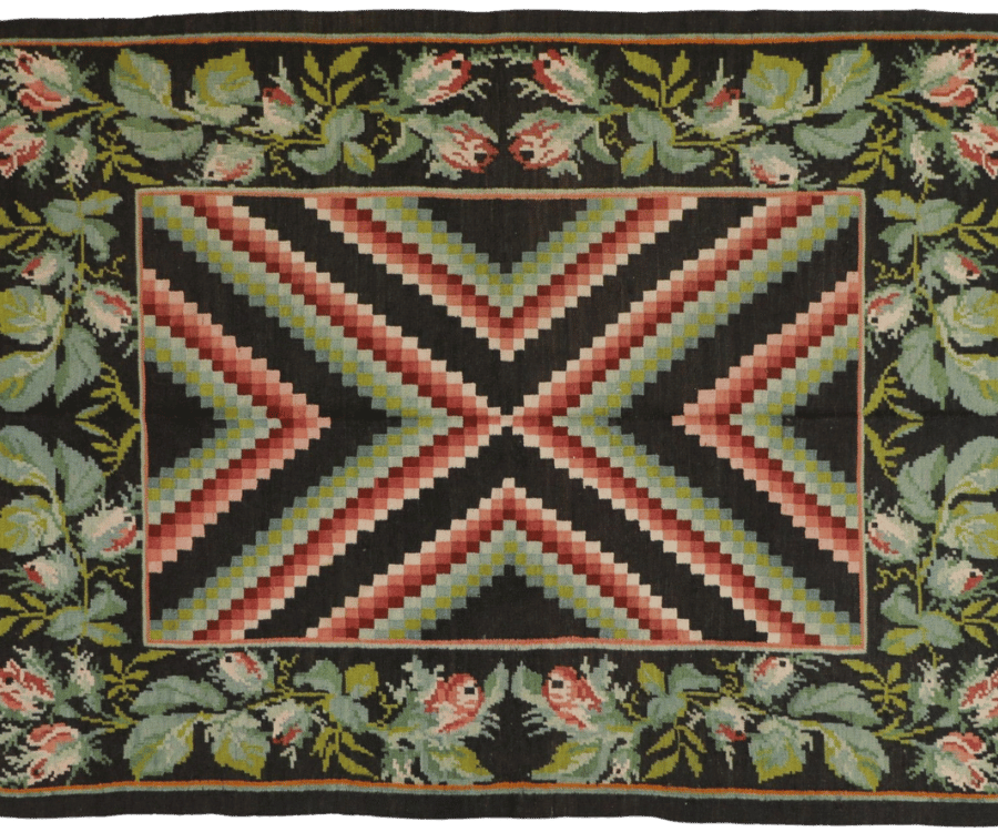 Ce kilim moldave se distingue par son fond noir profond, qui met en valeur un contraste saisissant entre un décor central graphique et une riche bordure florale. Le champ est animé par un jeu de chevrons colorés formant une composition en X, aux nuances de rouge, vert et beige, apportant rythme et dynamisme. Autour, une bordure généreusement ornée de motifs floraux délicats vient adoucir l’ensemble et créer un bel équilibre entre structure et ornement.
