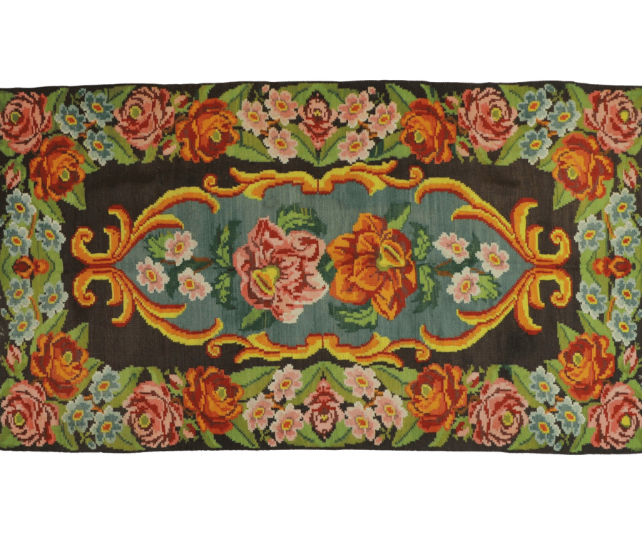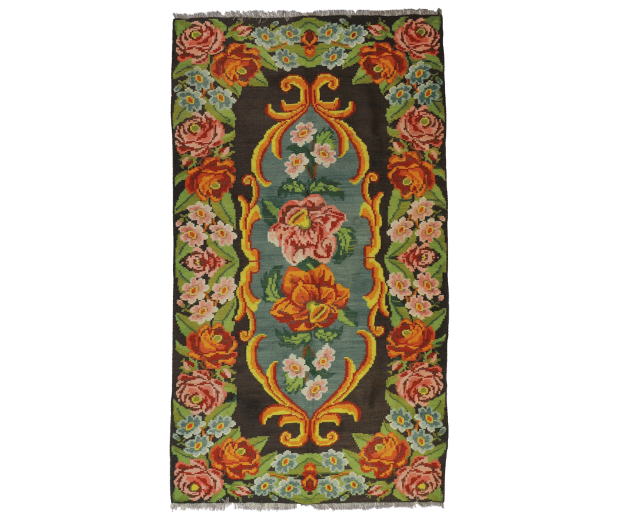 Ce kilim moldave se distingue par son champ central vert doux, encadré par un fond noir sombre qui met en valeur une composition florale riche et lumineuse. Au centre, un bouquet délicat de fleurs aux teintes orangées, roses et ivoire s’épanouit dans un médaillon allongé aux lignes élégantes. Cette structure apporte une lecture fluide et raffinée, tout en guidant naturellement le regard.