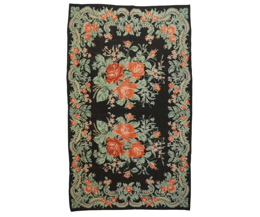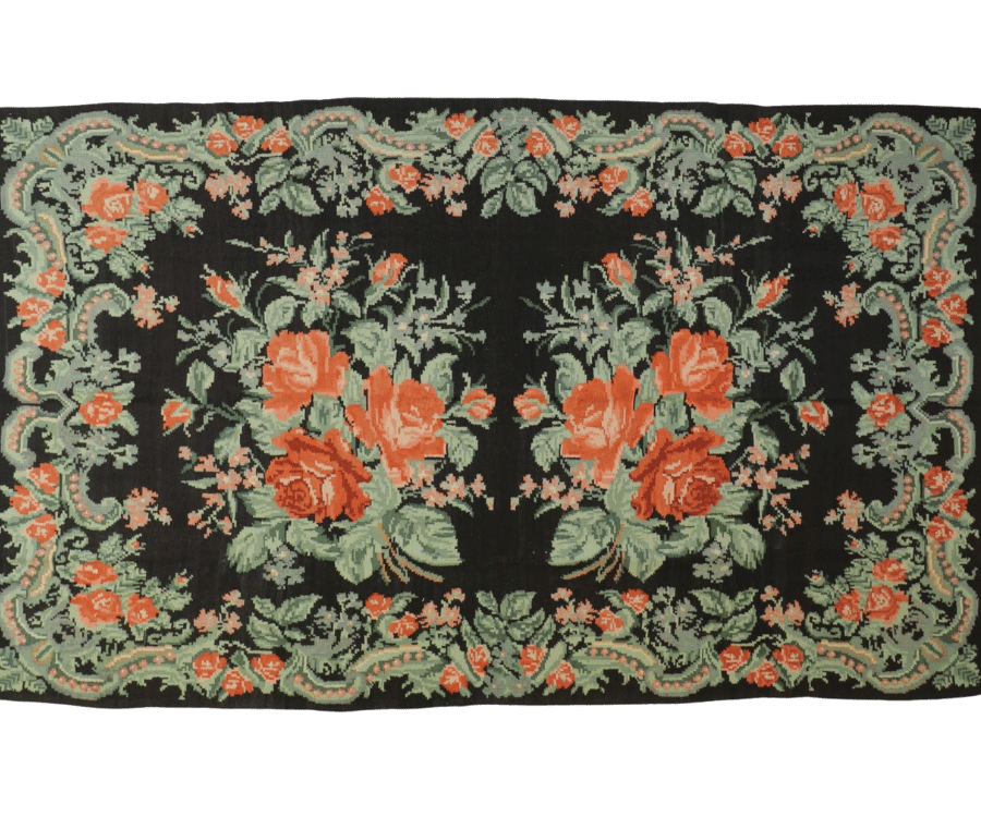 Ce kilim moldave se distingue par son fond noir profond, qui met en valeur une composition florale élégante et généreuse. Au centre, de larges bouquets de roses aux teintes orangées et corail s’épanouissent harmonieusement, entourés de feuillages vert doux. L’ensemble est encadré par une bordure finement travaillée aux motifs végétaux ondulants, apportant une touche de raffinement et de fluidité.