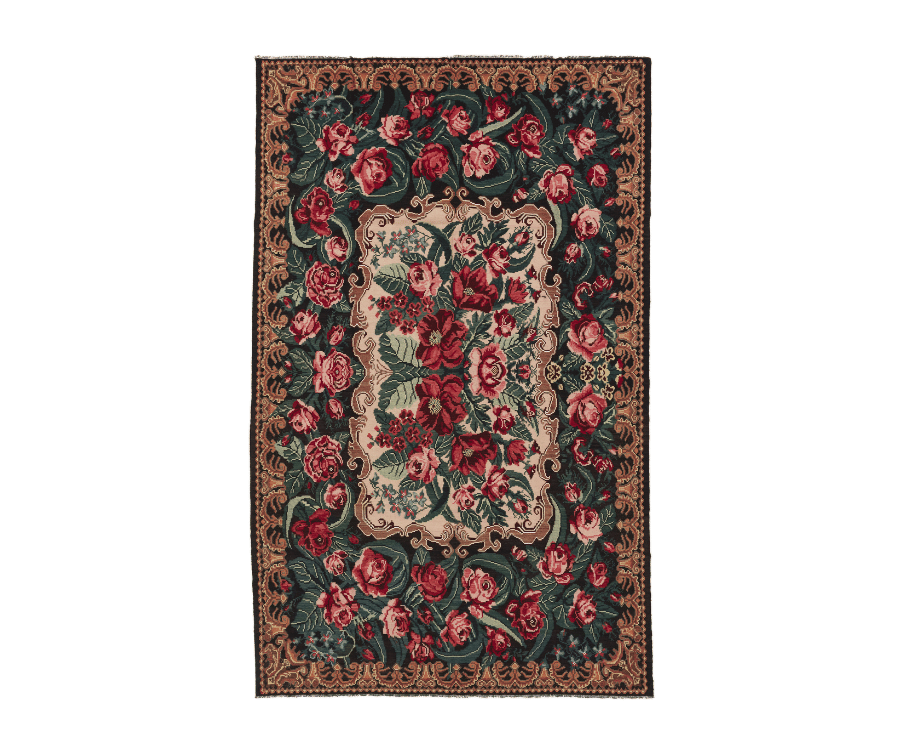 Ce kilim moldave est une véritable explosion de couleurs et de vie, avec son fond noir et ses superbes motifs floraux en bouquet. Tissé à la main en Moldavie, il reflète l’esthétique traditionnelle de l’Europe de l’Est, où les compositions florales généreuses apportent une touche de chaleur et d’élégance à n’importe quel espace. La richesse des couleurs et la densité du motif donnent à ce tapis un charme singulier, entre romantisme et caractère affirmé.