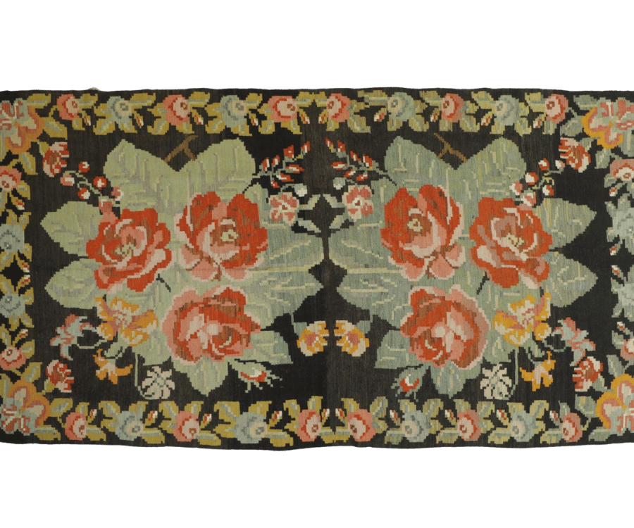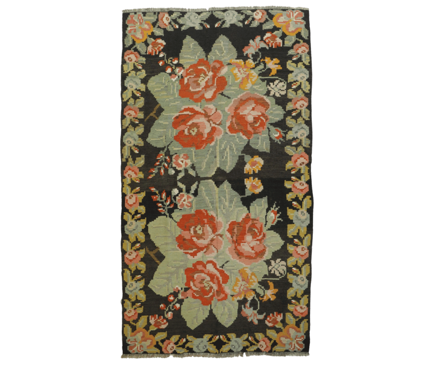 Ce kilim moldave se distingue par son champ central vert doux, encadré par un fond noir sombre qui met en valeur une composition florale riche et lumineuse. Au centre, un bouquet délicat de fleurs aux teintes orangées, roses et ivoire s’épanouit dans un encadrement ornemental aux lignes élégantes, créant une structure visuelle raffinée et équilibrée.