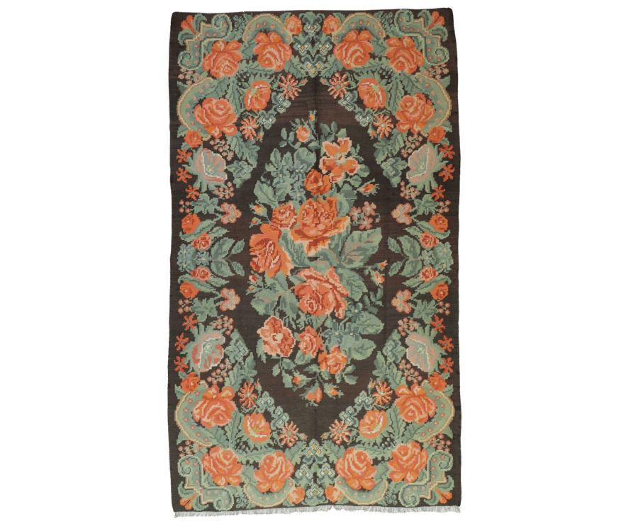 Ce kilim moldave se distingue par son fond noir, qui met en valeur une composition florale généreuse et délicatement structurée. Au centre, un bouquet de fleurs aux teintes orangées et vert doux s’épanouit avec élégance, entouré d’une bordure richement ornée de motifs végétaux. L’ensemble crée une harmonie chaleureuse, où chaque élément semble s’entrelacer avec fluidité.
