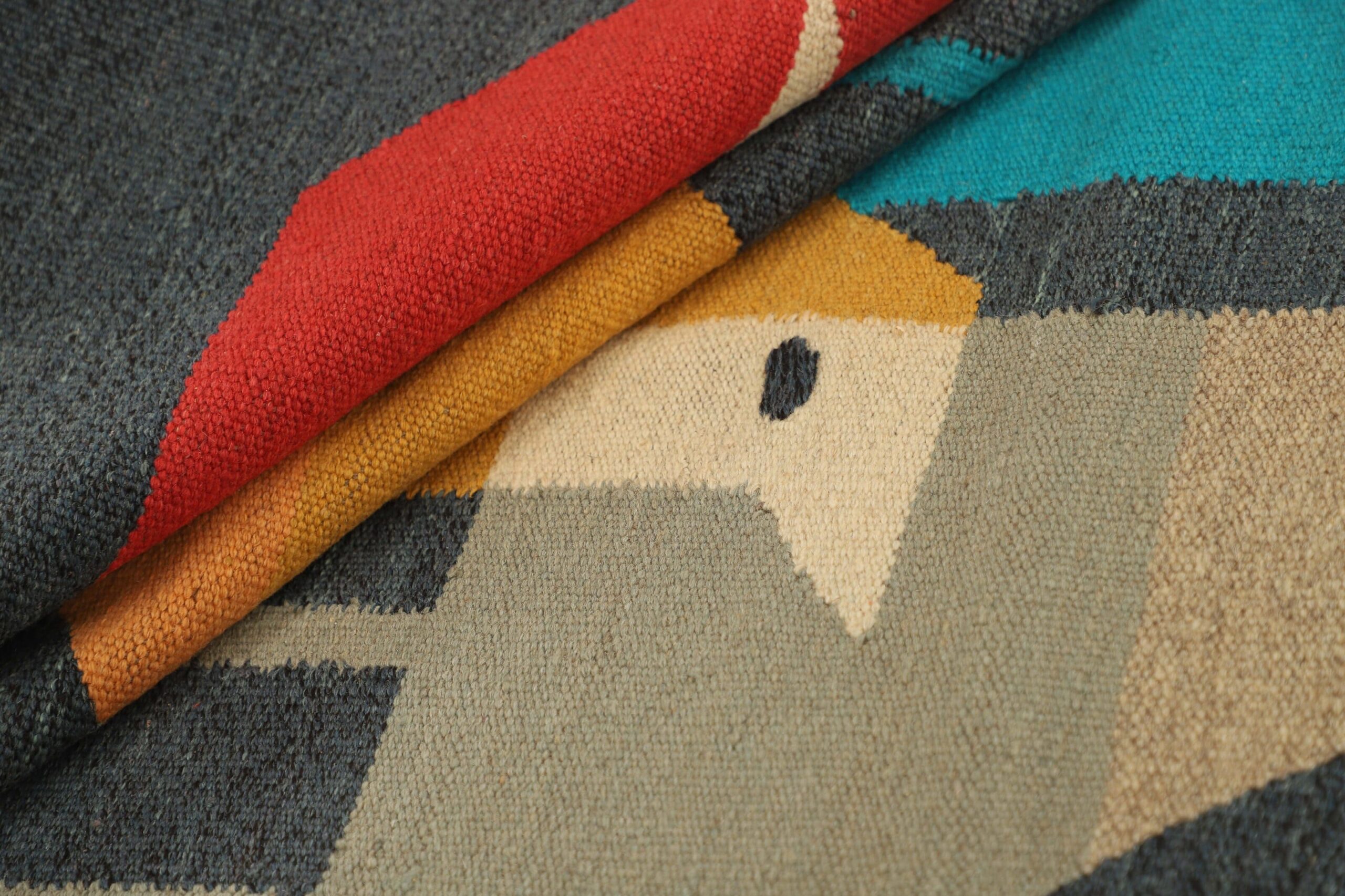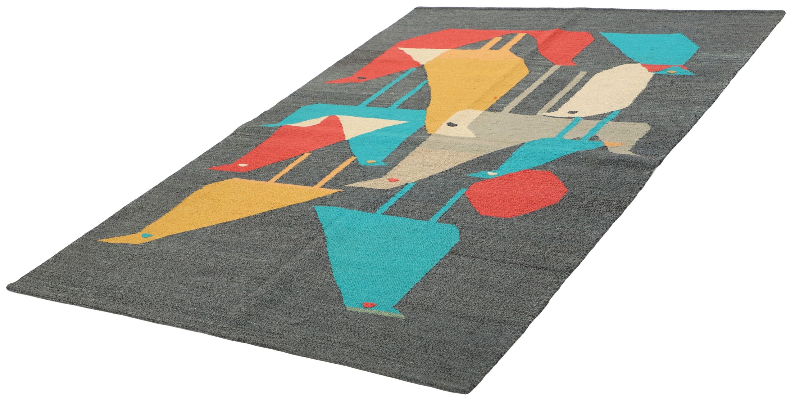 Ce kilim Savana originaire d’Iran séduit par son fond gris profond qui met en valeur une composition graphique audacieuse. Les silhouettes d’oiseaux stylisés, aux teintes turquoise, rouge, jaune et beige, s’organisent avec équilibre dans un esprit à la fois figuratif et géométrique. L’ensemble crée un contraste moderne et dynamique, tout en conservant l’authenticité d’un travail artisanal tissé à la main.