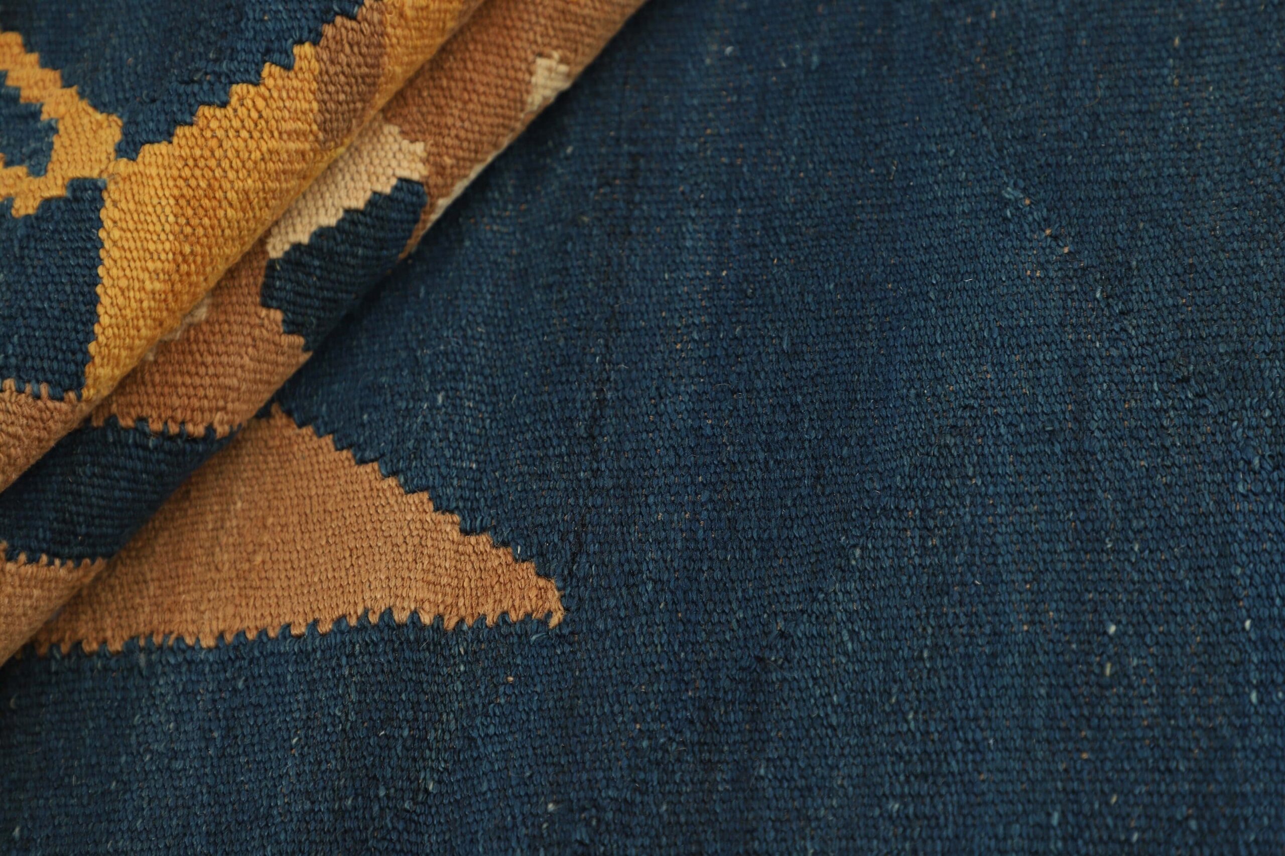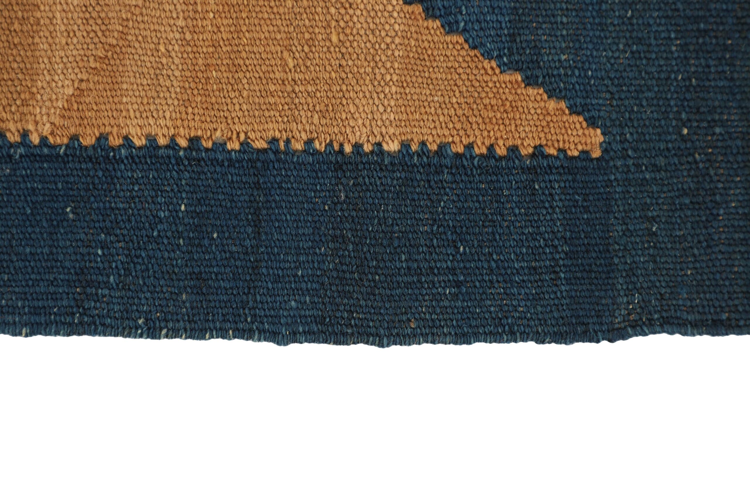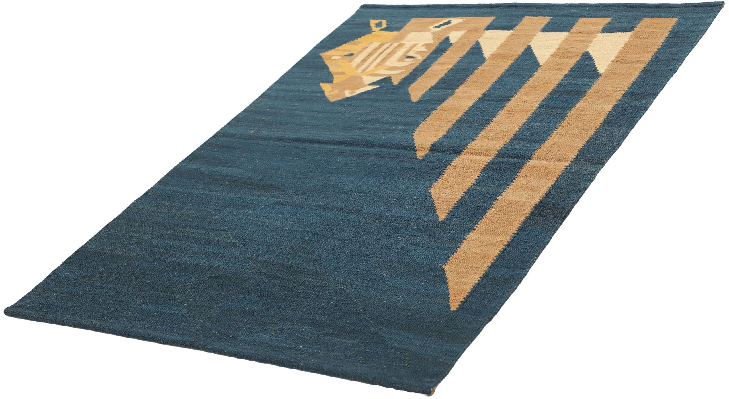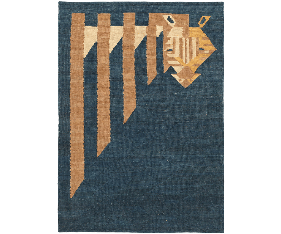 Ce kilim de la collection Savana se distingue par son fond bleu profond, intense et enveloppant. Sur cette base sobre et puissante se déploie une composition graphique originale mêlant formes géométriques élancées et figure animalière stylisée. L’ensemble crée un contraste fort entre le bleu dense du champ et les nuances sable et ocre du motif.