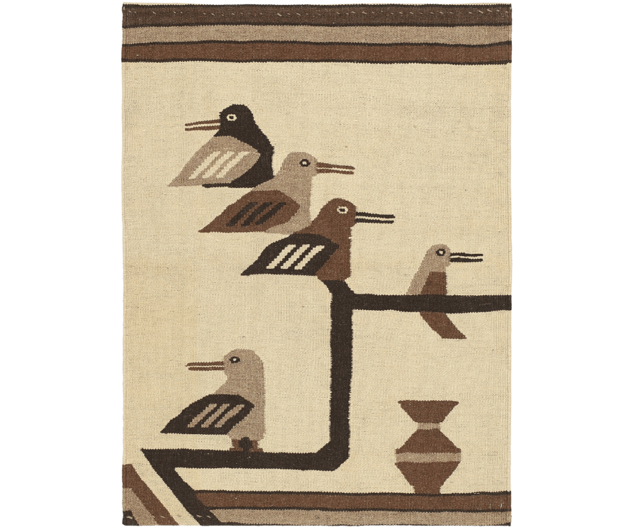 Ce kilim Savana originaire d’Iran séduit par son fond beige lumineux, doux et naturel, qui apporte immédiatement une sensation d’équilibre et de sérénité. Sur cette base claire se déploie une scène figurative délicate représentant des oiseaux stylisés posés sur des branches graphiques, accompagnés d’un jeu de lignes sobres en partie haute.