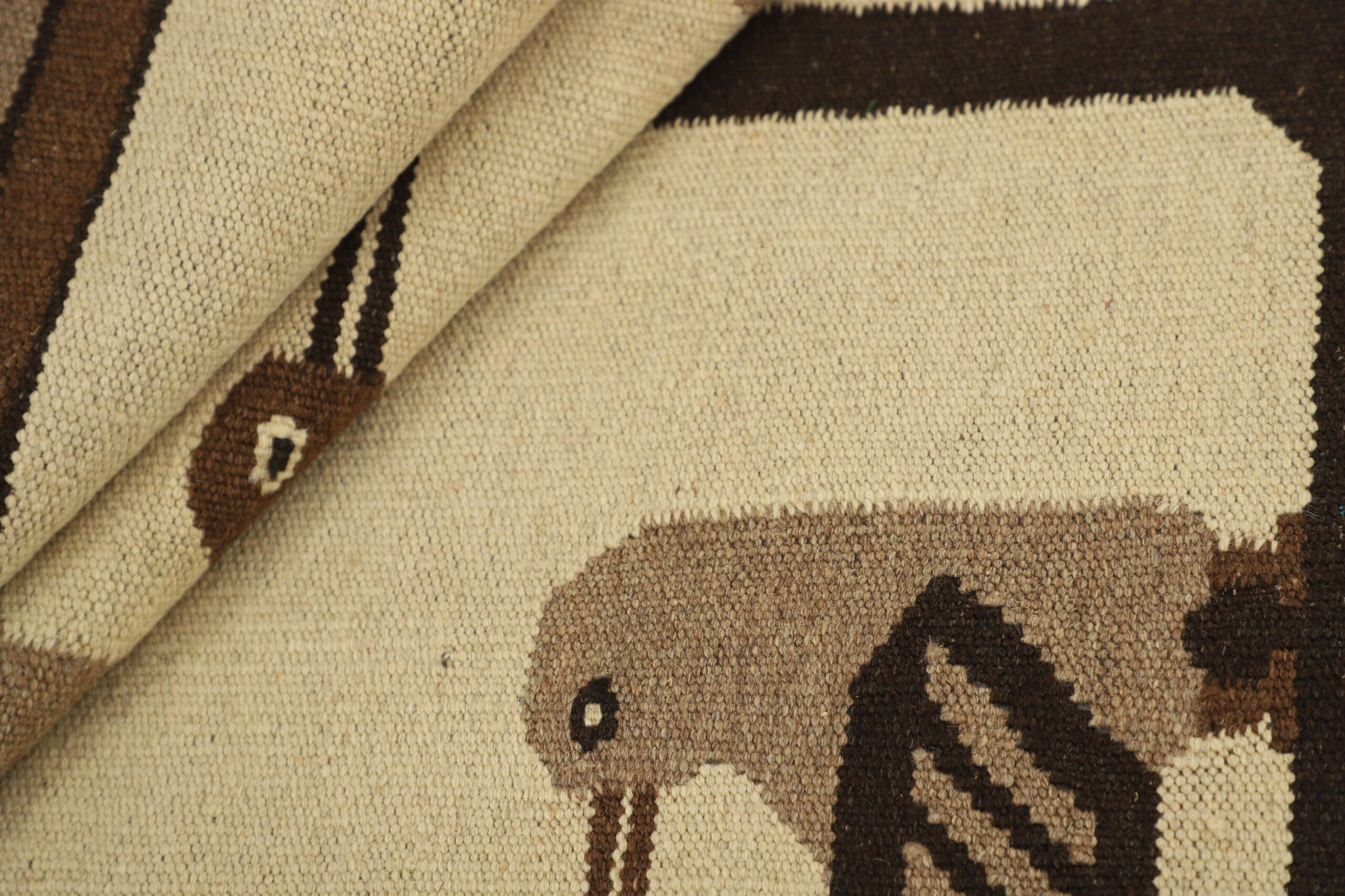 La palette, composée de bruns et de beiges nuancés, renforce l’élégance discrète de l’ensemble. La composition est volontairement épurée, laissant respirer le fond tout en mettant en valeur le dessin. Tissé à la main selon un savoir-faire artisanal iranien, ce kilim conjugue authenticité et modernité avec subtilité.