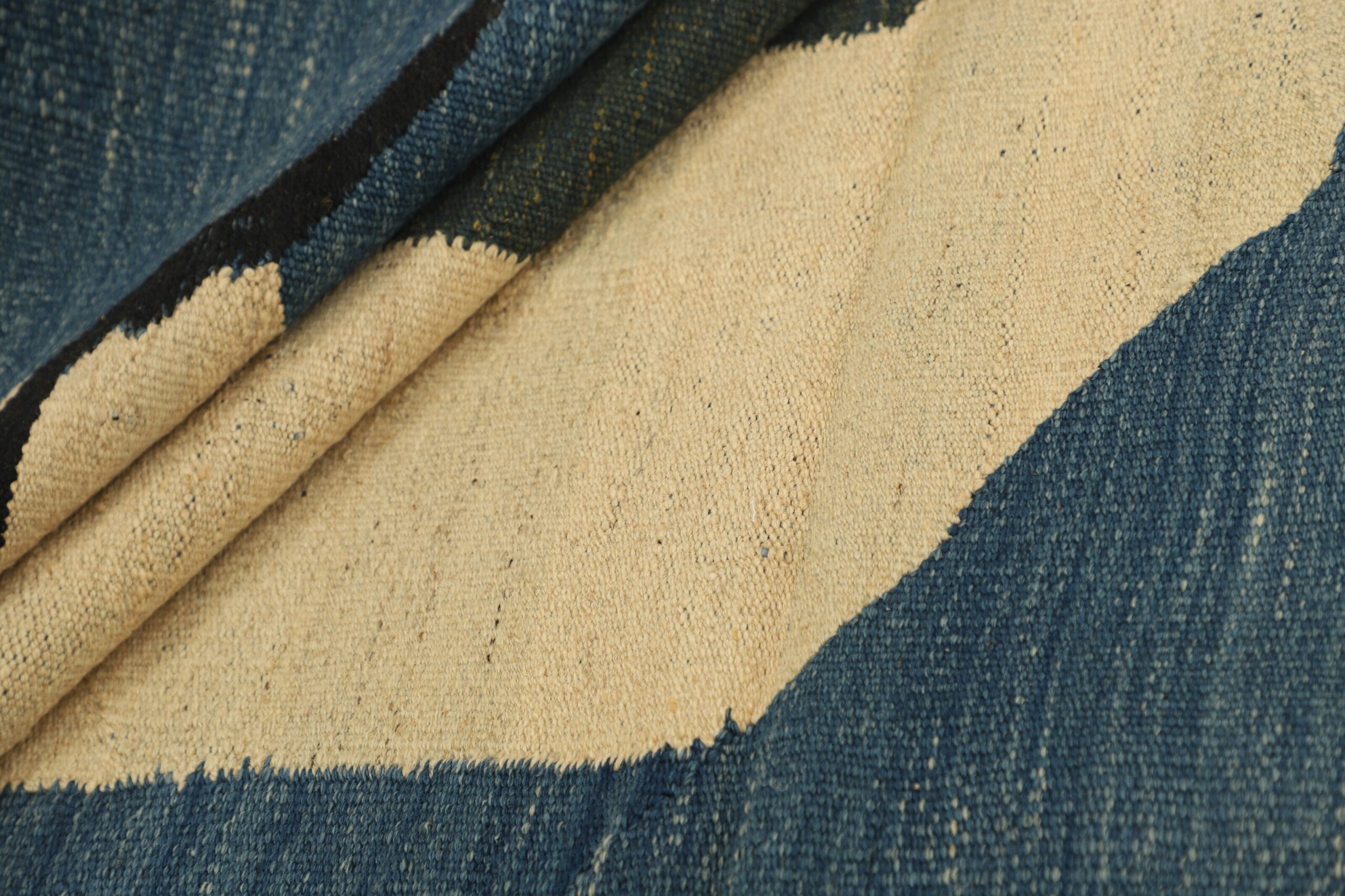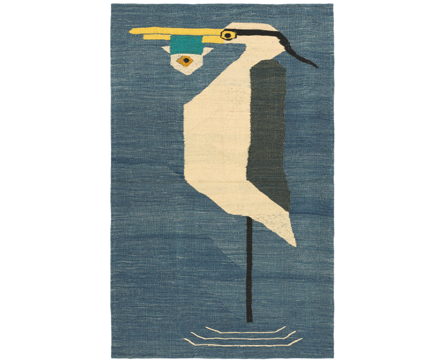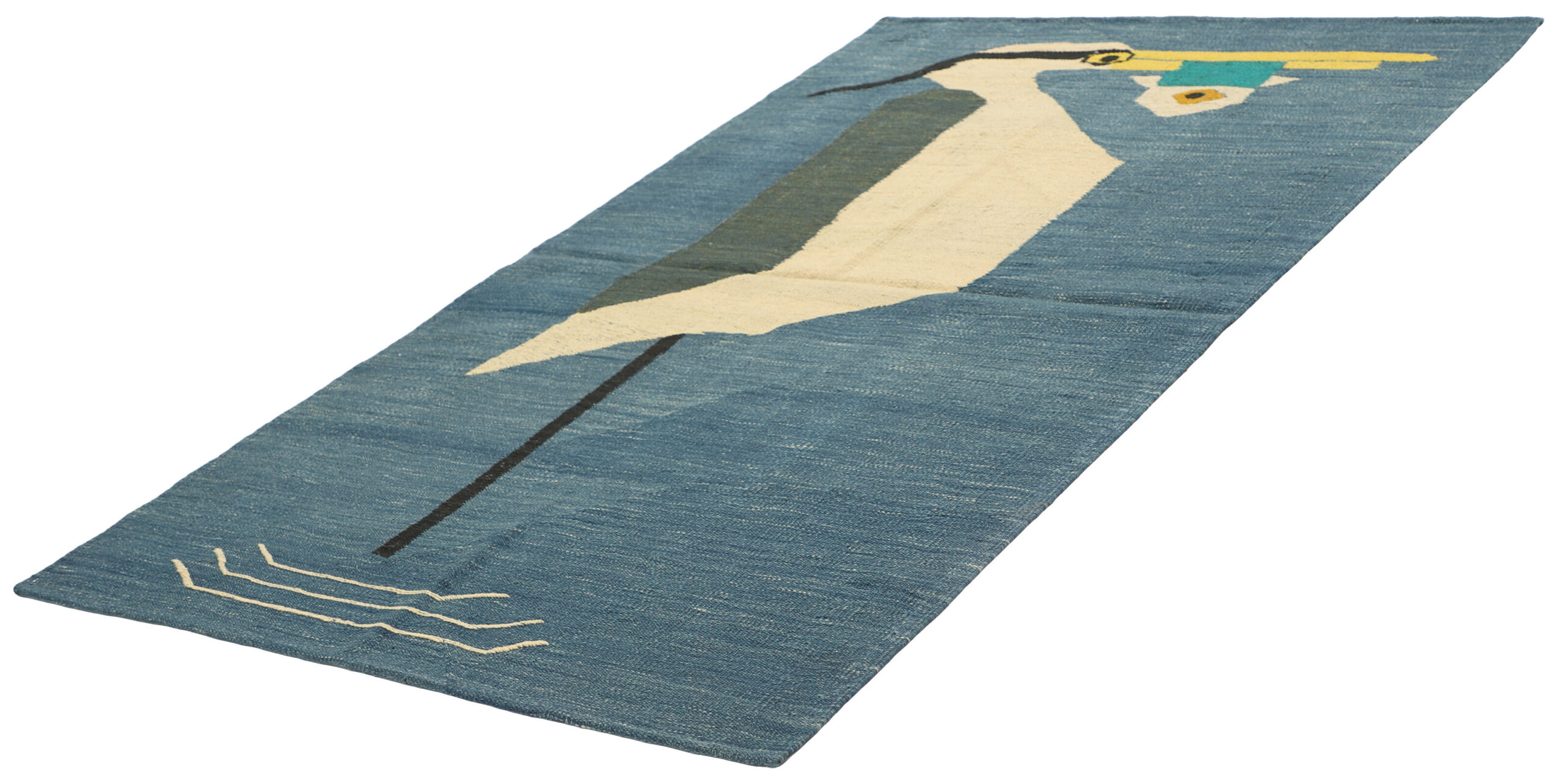 Ce kilim Savana tissé main en Iran séduit par son fond bleu profond et apaisant, évoquant l’eau et le ciel. En son centre, un oiseau stylisé se tient avec élégance, tenant délicatement un petit poisson dans son bec. La composition est volontairement minimaliste, laissant respirer le motif sur un large champ uni.