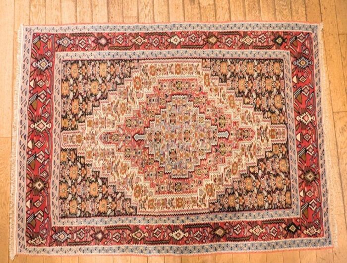 Ce Kilim persan Senneh, tissé à la main, incarne l’élégance et la finesse de l’artisanat traditionnel. Avec son médaillon central détaillé et ses bordures raffinées, il arbore une palette chaleureuse de couleurs saumons et de bleus