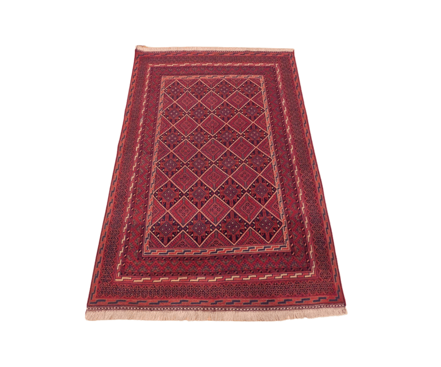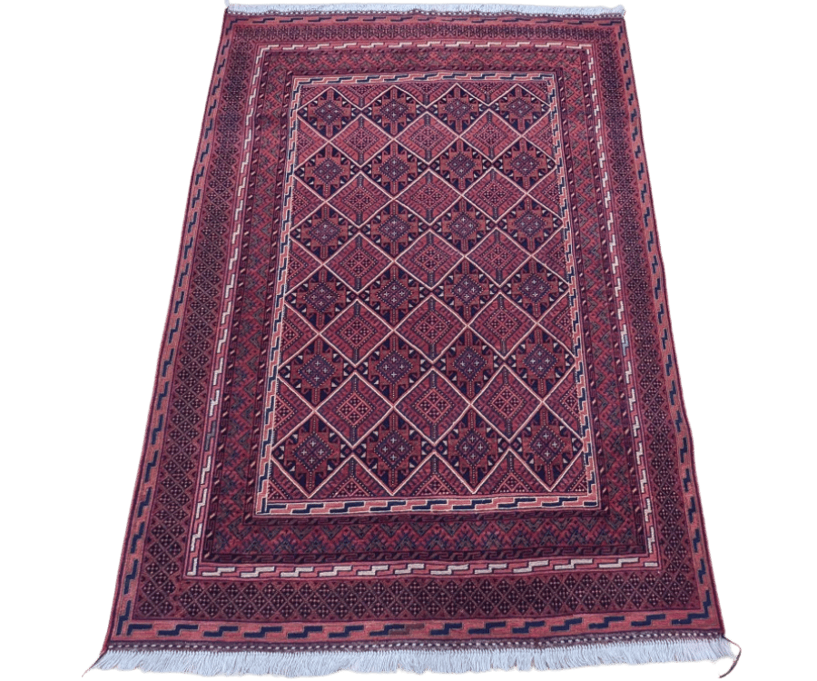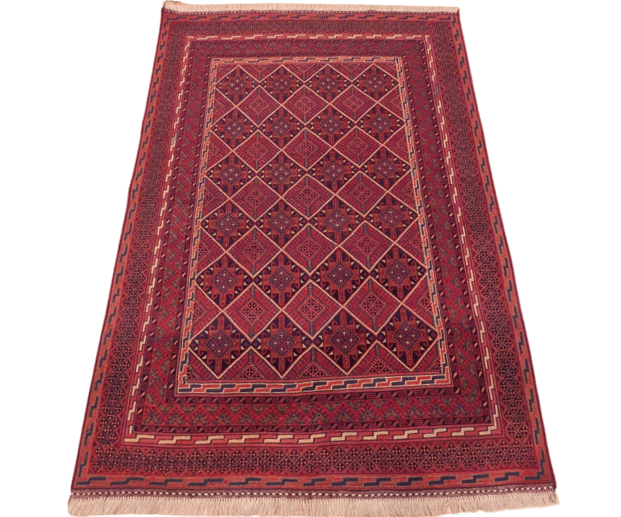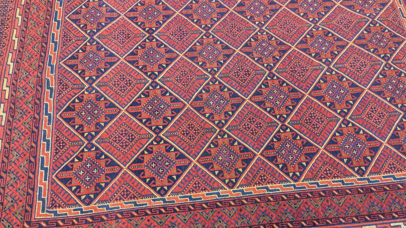 Ce tapis Soumak Nakhonak se distingue par son fond rouge profond et intense, qui domine largement le champ et confère à la pièce une présence forte et élégante. La composition est structurée par un réseau de losanges imbriqués, chacun richement décoré de motifs géométriques minutieux, créant un effet visuel dense et rythmé.
