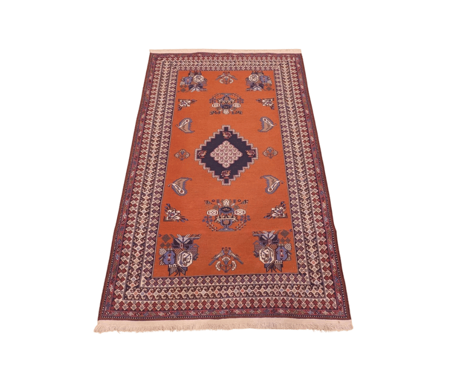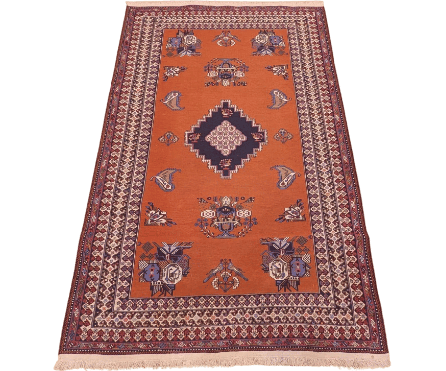 Ce tapis Soumak Souzani Afchar se distingue par un fond orange terre cuite, une teinte chaude et enveloppante qui structure toute la composition. Ce champ uni met en valeur un médaillon central sombre, contrasté et richement détaillé, autour duquel s’organisent des motifs figuratifs et symboliques typiques des traditions tribales.