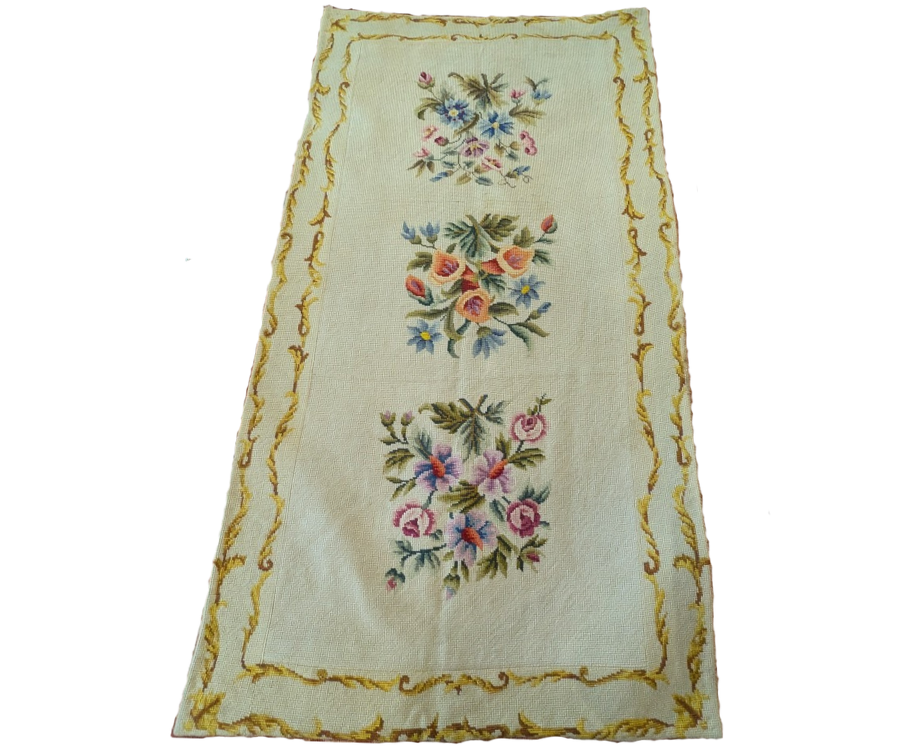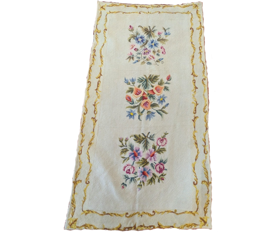 Une composition florale structurée : Les trois bouquets répartis avec précision évoquent l’équilibre et la délicatesse des tapis de style français.
