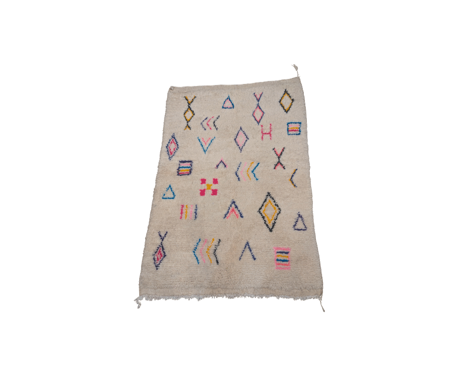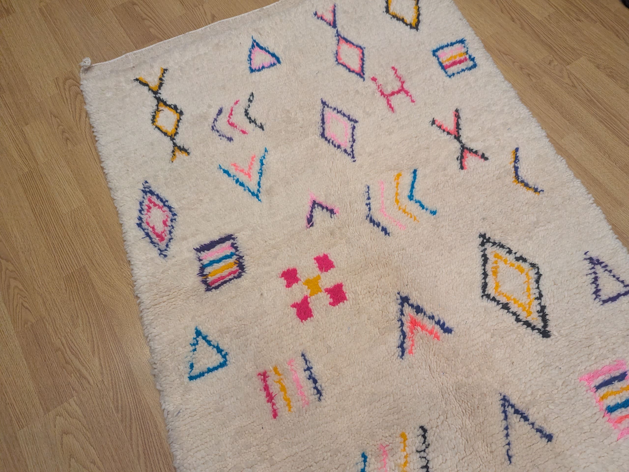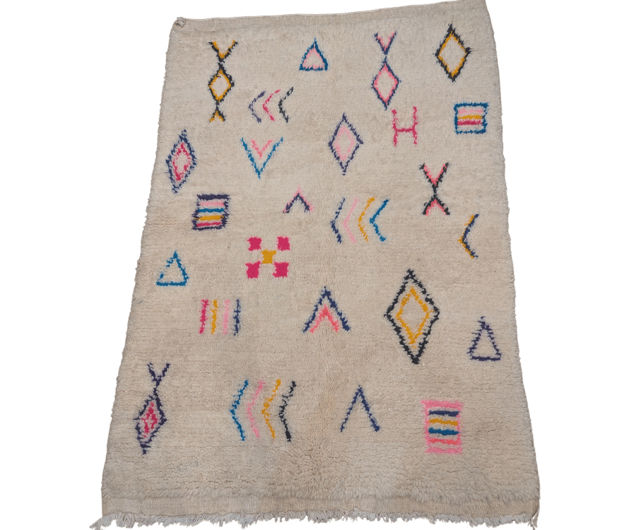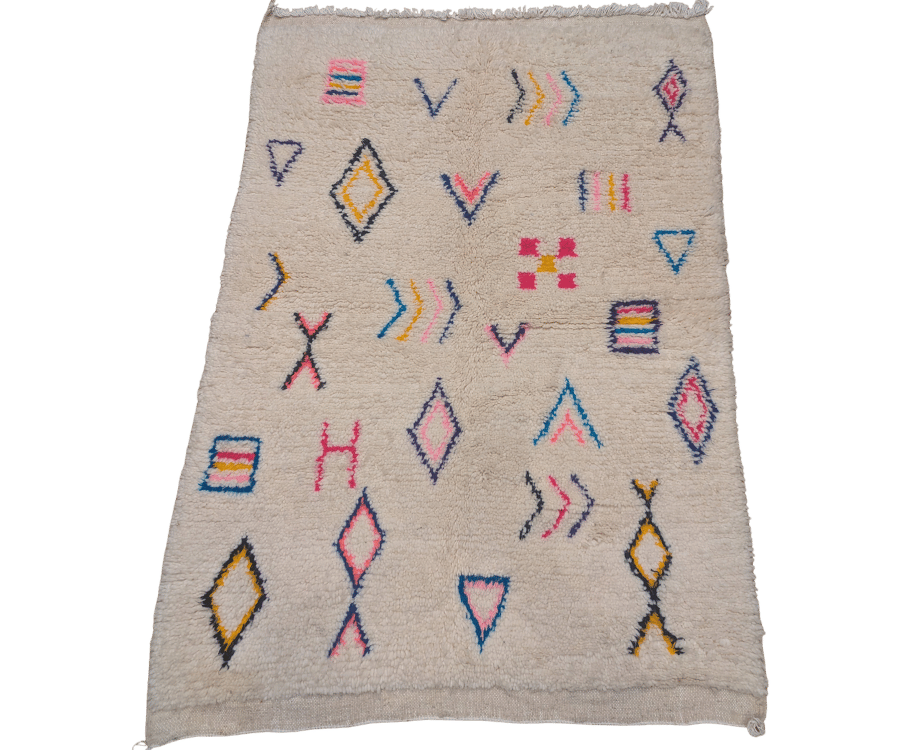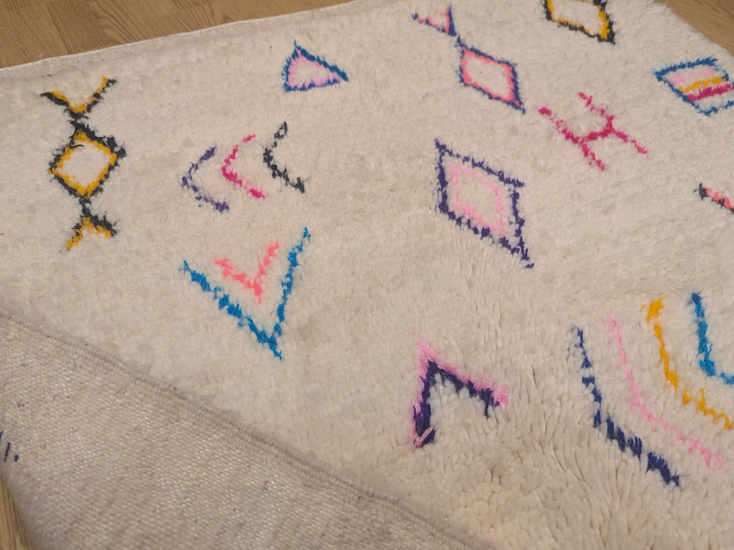 Ce tapis Azilal originaire du Maroc se distingue par son fond blanc écru lumineux, animé de motifs géométriques et symboles berbères aux couleurs vives. Rose fuchsia, bleu électrique, jaune safran et touches de noir viennent ponctuer la surface avec spontanéité et fraîcheur.