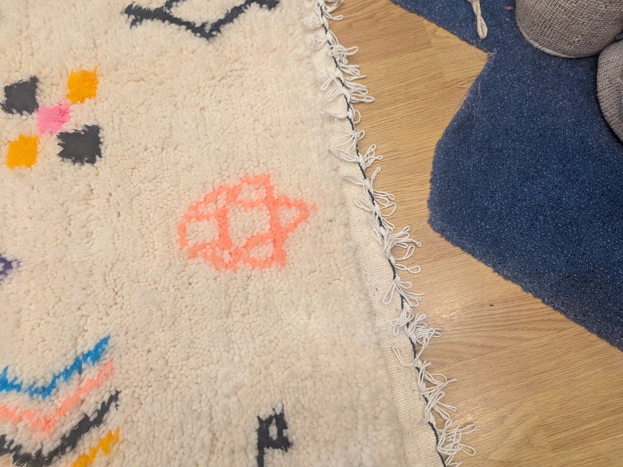 Ce tapis Azilal noué à la main dans les montagnes du Moyen-Atlas marocain révèle toute la créativité des artisans berbères. Sur un fond blanc et lumineux, une myriade de symboles colorés se déploient avec légèreté, donnant à cette pièce une personnalité vive et artistique. Chaque motif, souvent abstrait ou figuratif, raconte une histoire, un geste, une intuition.