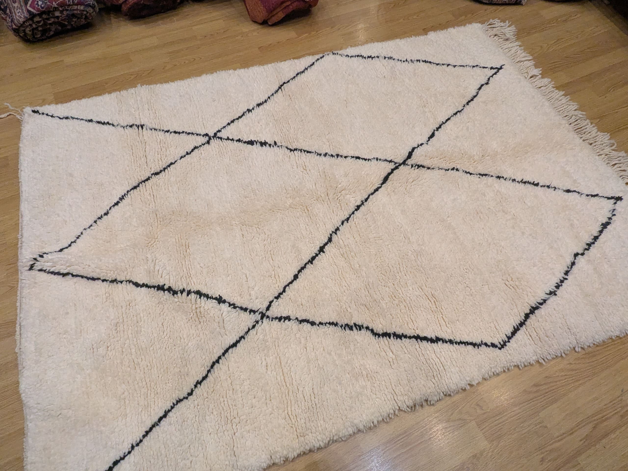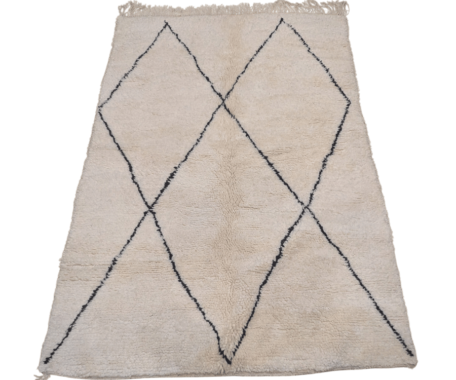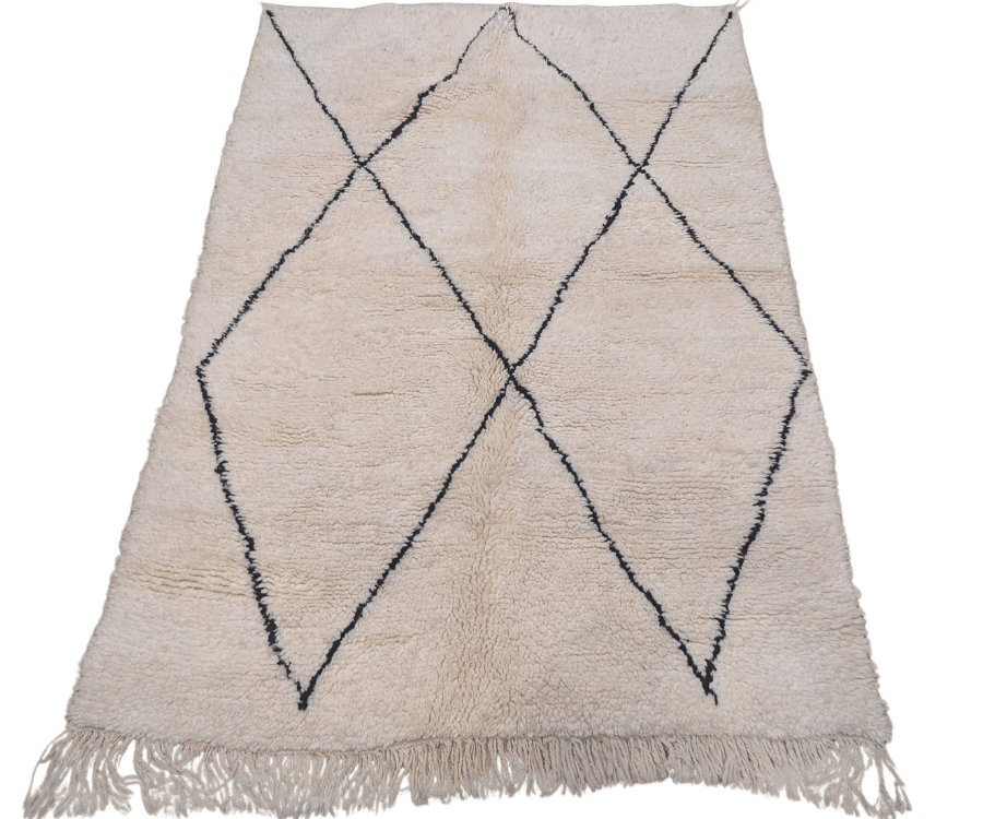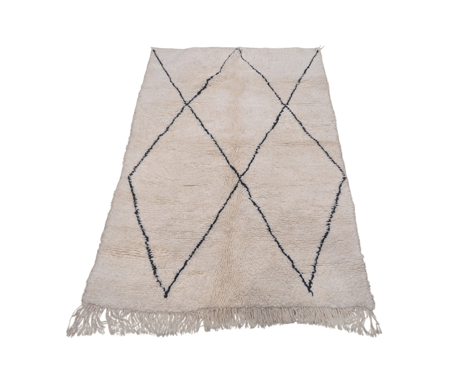 Ce tapis Beni Ouarain originaire du Maroc séduit par son fond blanc écru lumineux, presque crème, qui apporte une sensation immédiate de clarté et de douceur. Le motif de losanges noirs, tracé à main levée, structure subtilement la surface avec un contraste graphique à la fois fort et minimaliste. Les lignes légèrement irrégulières témoignent du travail artisanal et renforcent son authenticité.