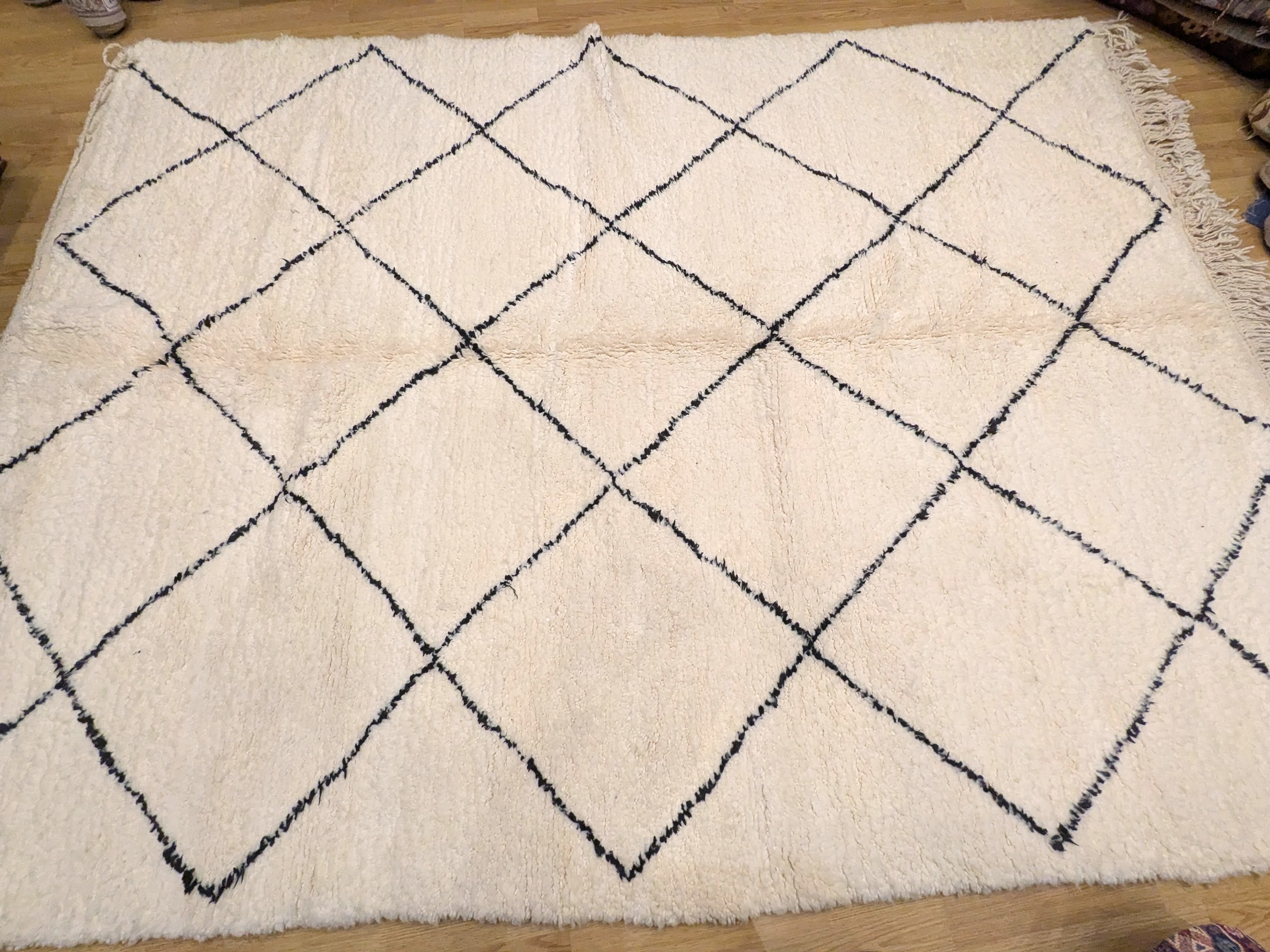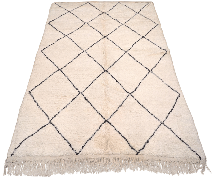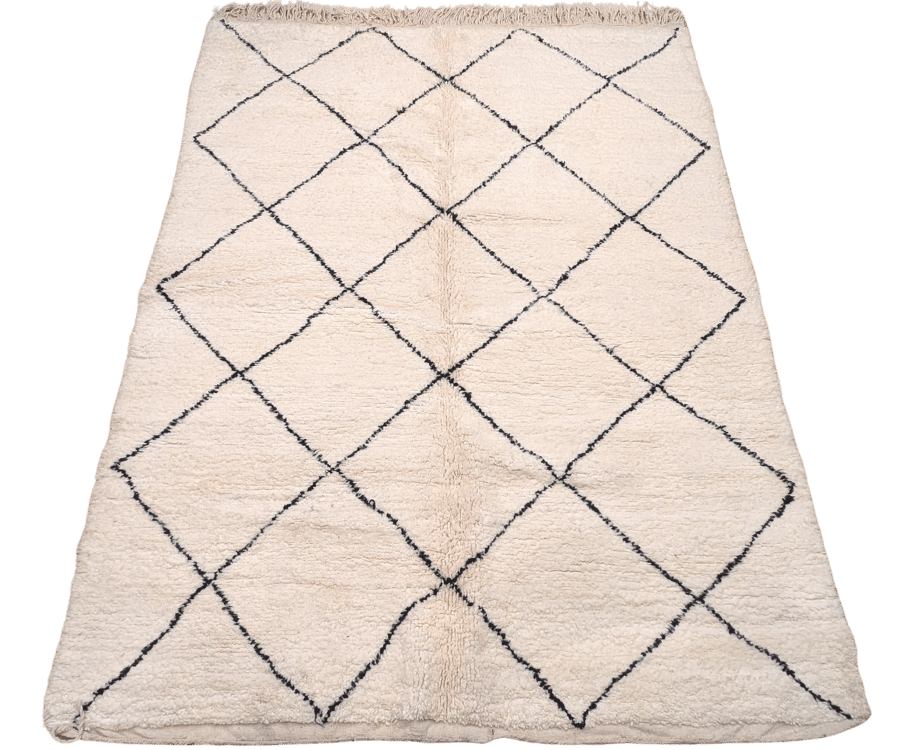Ce tapis Beni Ouarain, tissé à la main au Maroc, reflète la pureté et la simplicité du design berbère. Sur un fond blanc crème moelleux, un élégant motif de losanges noirs s’étire avec régularité, conférant à la pièce une allure à la fois épurée et graphique.