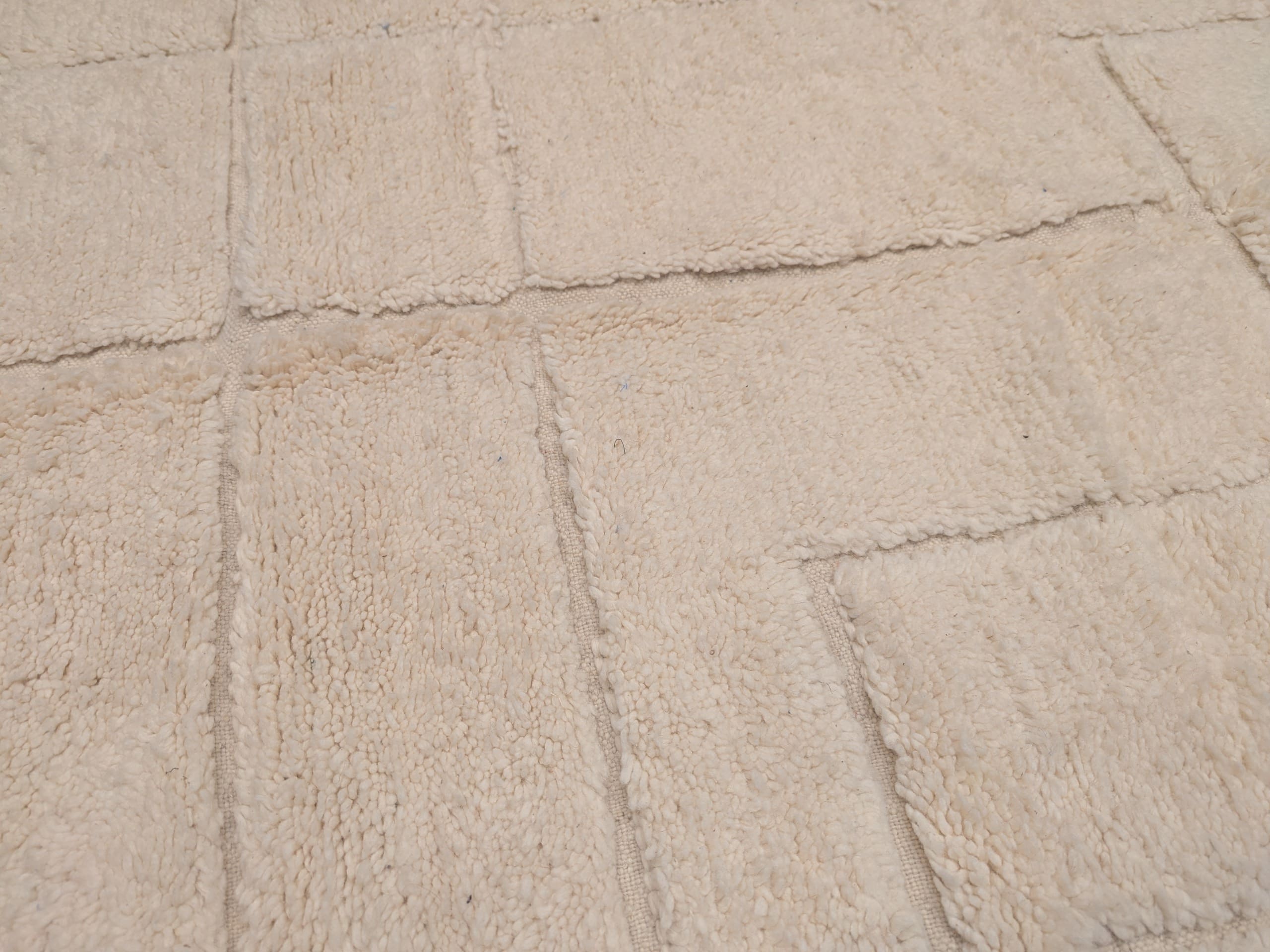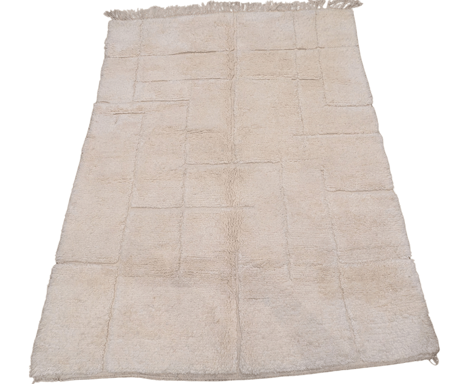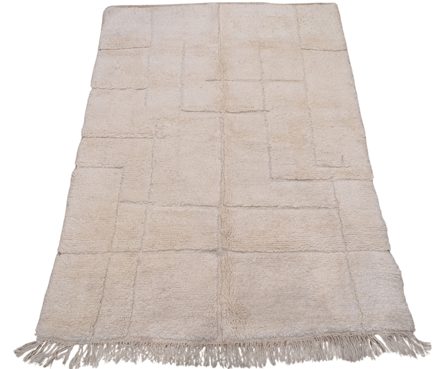 Ce tapis Beni Ouarain originaire du Maroc séduit par son fond blanc écru lumineux, presque crème, qui apporte une sensation immédiate de douceur et de clarté. Son motif géométrique ton sur ton, formé de lignes discrètement sculptées dans la laine, crée un relief subtil et élégant. Le dessin reste volontairement minimaliste, laissant la matière et la texture s’exprimer pleinement.