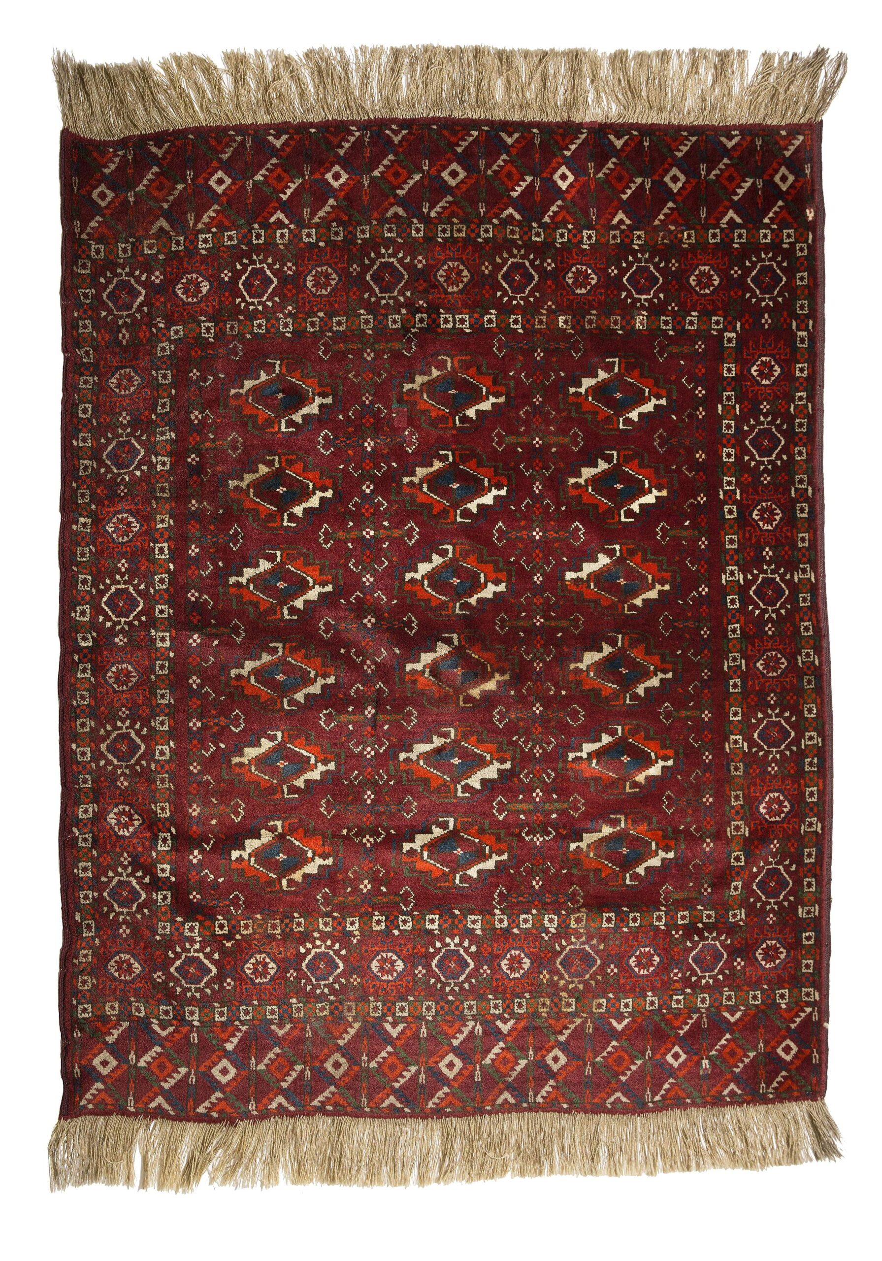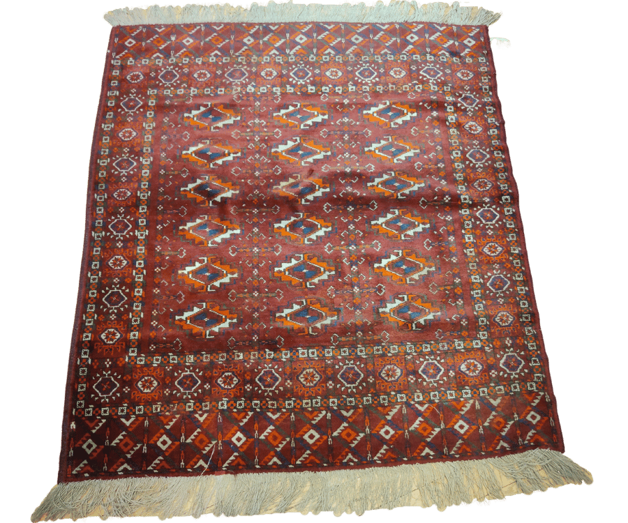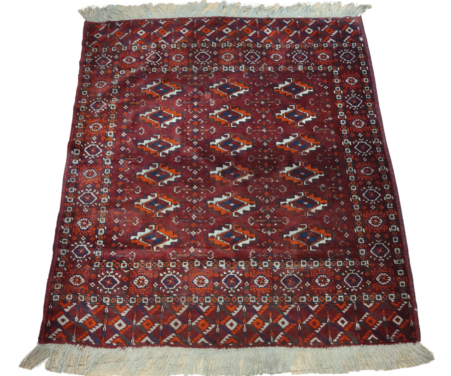 Ce tapis Boukhara turkmène séduit par son rouge profond, ponctué de motifs géométriques éclatants en bleu, ivoire et orange. Il reprend la structure typique des tapis Tekke, avec des figures disposées en répétition régulière, dans un équilibre parfait entre densité et vivacité. Noué à la main, il incarne l’âme artisanale d’un savoir-faire ancestral, transmis de génération en génération au Turkménistan.