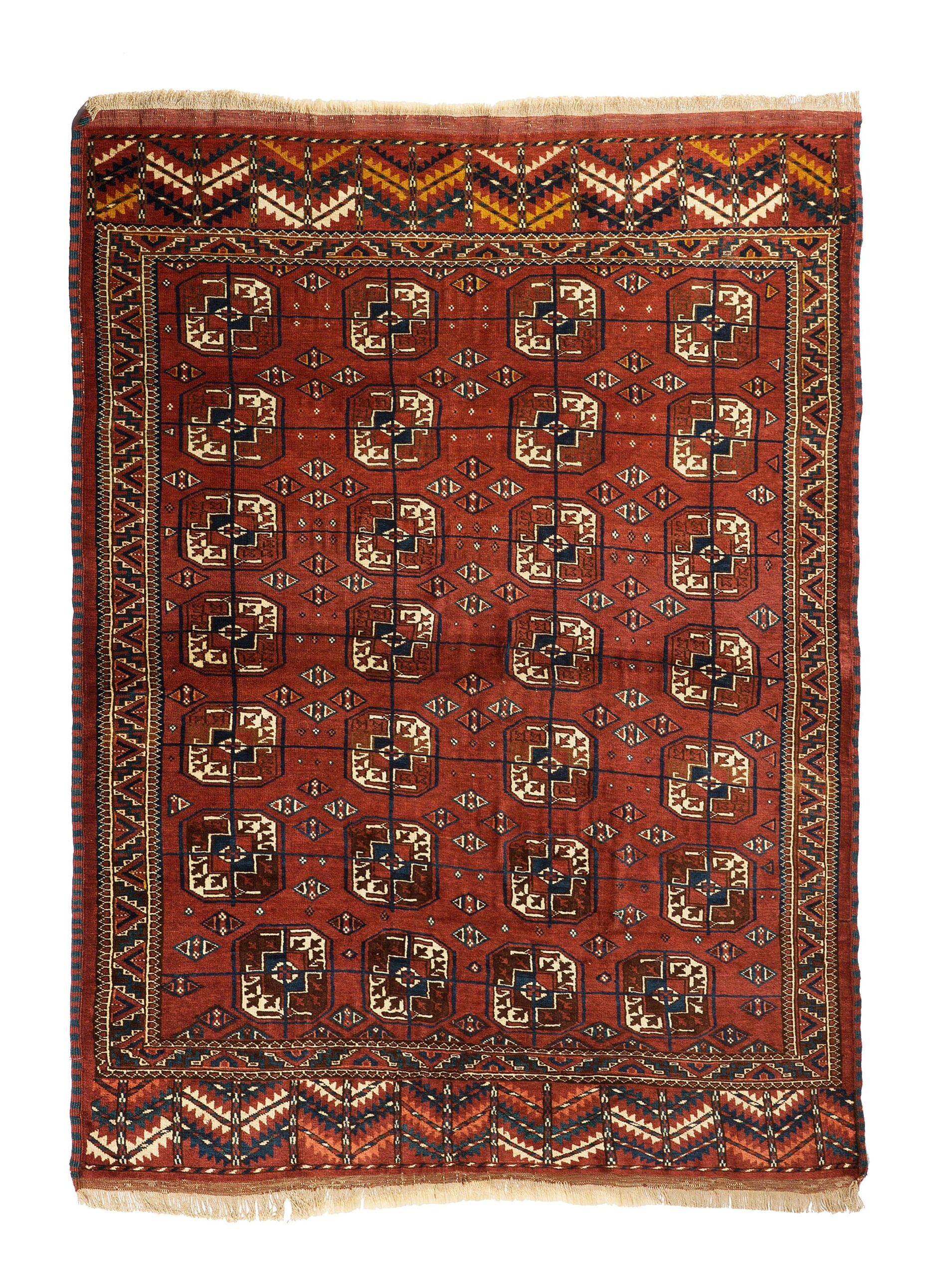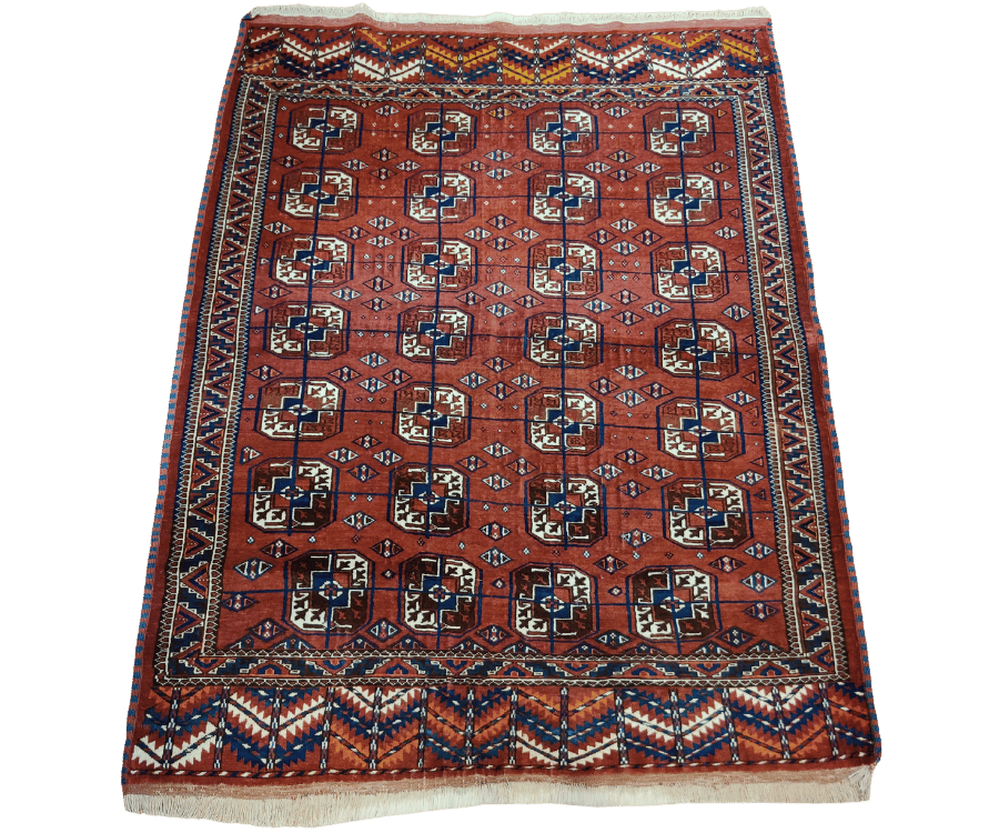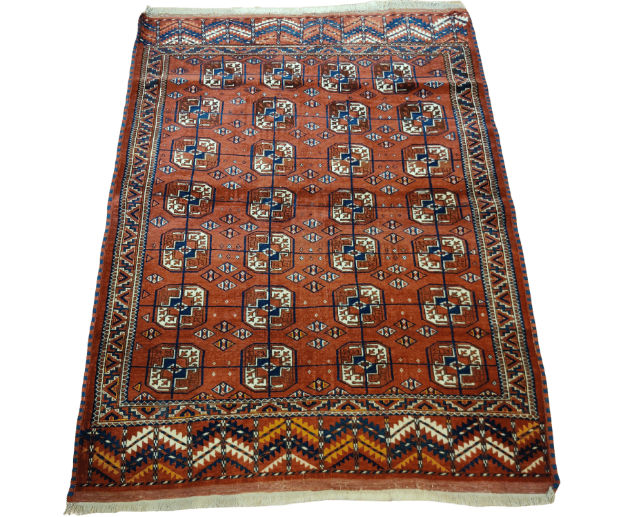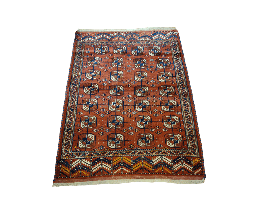 Ce tapis Boukhara noué à la main au Turkménistan illustre parfaitement la tradition textile des peuples turkmènes. Son champ rouge intense est rythmé par une répétition de motifs Guhl — ces formes géométriques emblématiques appelées « pattes d’éléphant » — encadrés par une bordure travaillée, mêlant losanges et frises en dents de loup. Les touches de bleu, ivoire et brun ajoutent profondeur et contraste à l’ensemble.