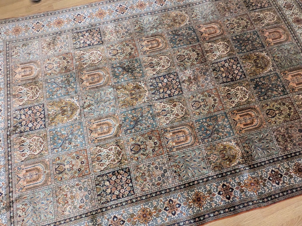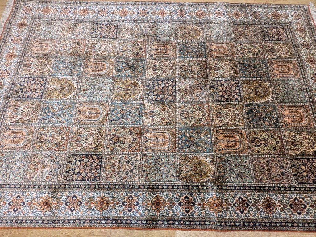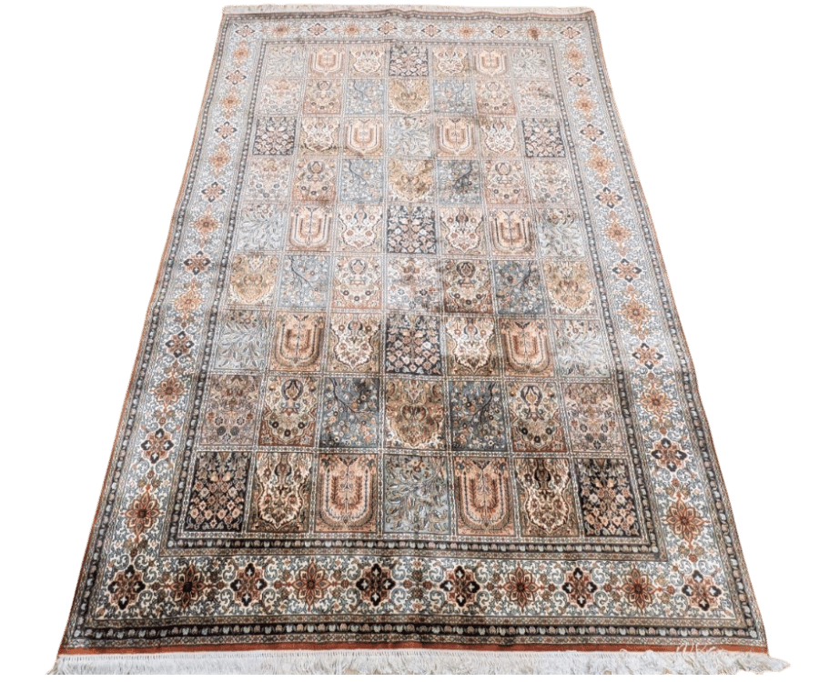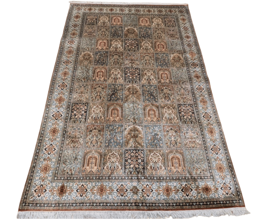 Ce tapis noué à la main au Cachemire met à l’honneur le style 4 saisons, reconnu pour sa composition en damier mêlant motifs floraux, arabesques et symboles décoratifs. Chaque panneau présente un dessin unique dans des nuances dominantes de bleu-gris, rehaussées de beige, brun et ivoire. L’ensemble forme une œuvre équilibrée et riche, tout en gardant une belle clarté visuelle.