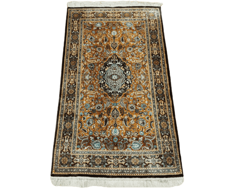 Ce tapis Cachemire noué main, en provenance de l’Inde, séduit par son fond orange lumineux rehaussé de motifs floraux délicats et d’un médaillon central sophistiqué. Sa composition dense, associée à des teintes turquoise, ivoire et brun foncé, évoque la richesse visuelle des grands classiques persans tout en apportant une touche vibrante et raffinée.