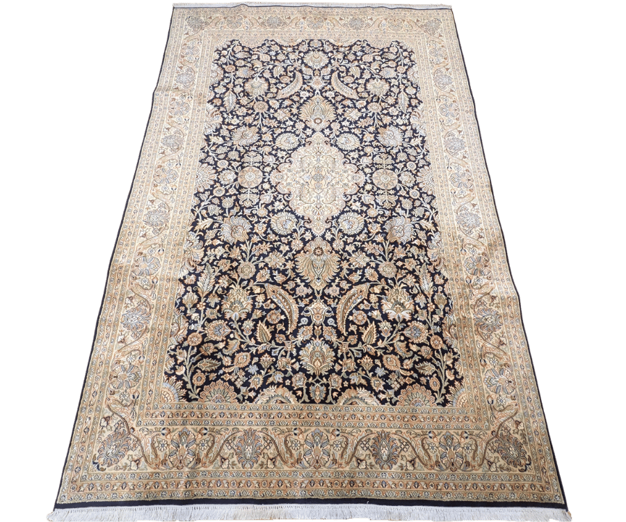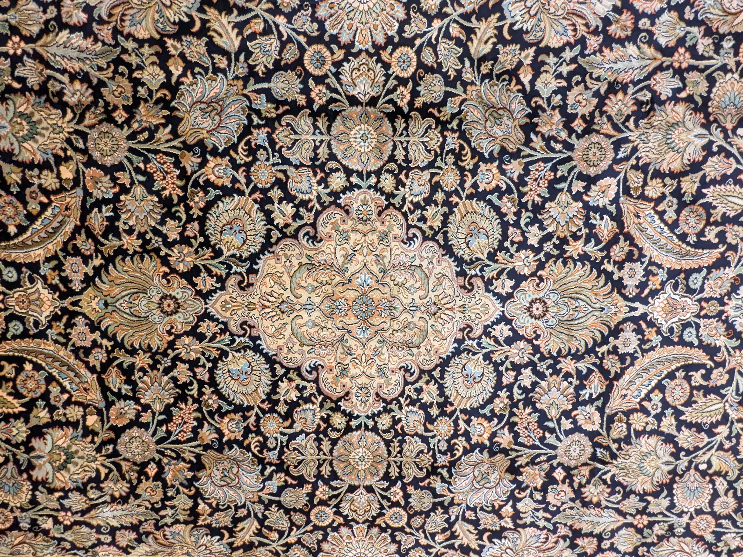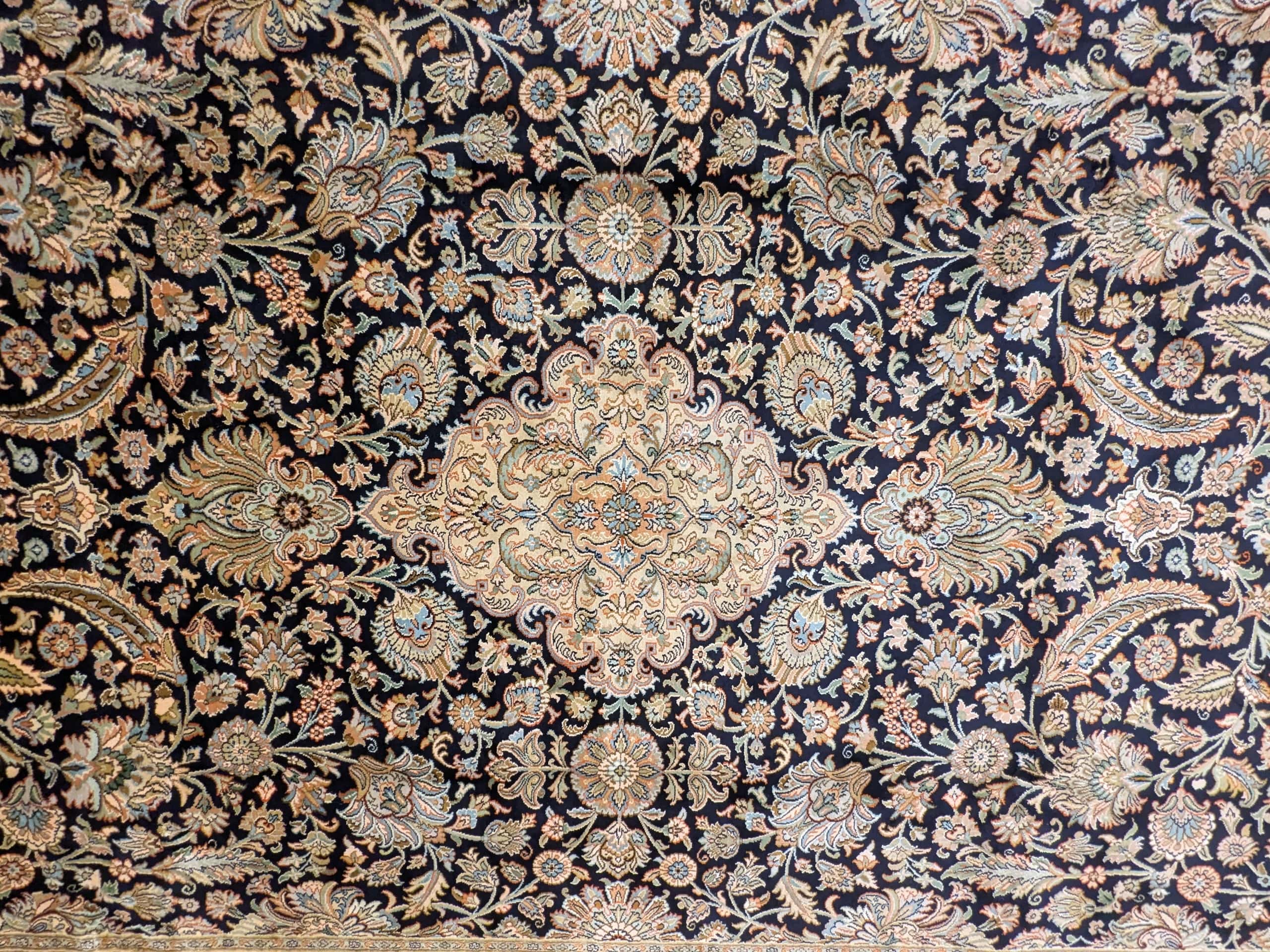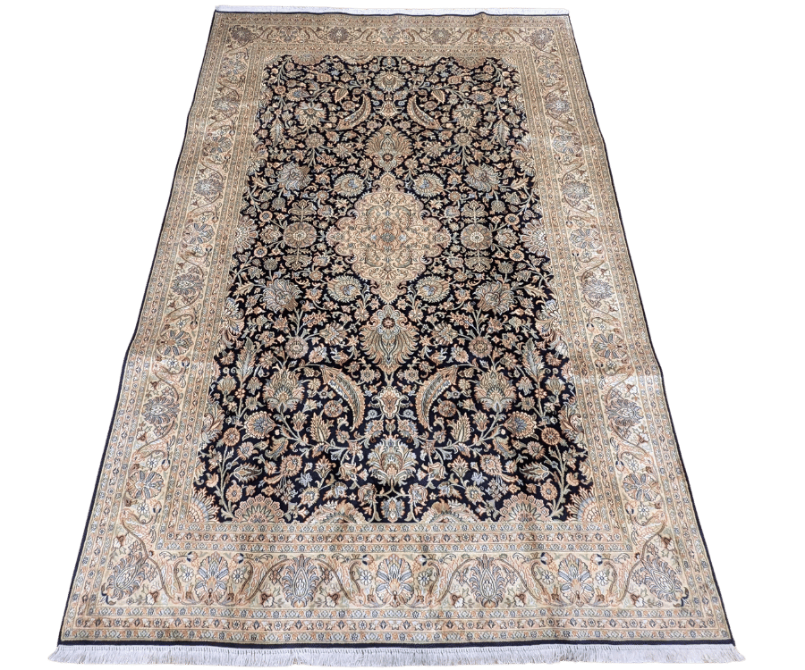Ce tapis Cachemire, noué main en Inde, incarne l’excellence des traditions textiles du nord du sous-continent. Sur un fond noir profond, il déploie une composition florale foisonnante, dominée par un médaillon central délicatement orné. Un travail raffiné qui révèle tout le prestige de l’artisanat cachemiri.