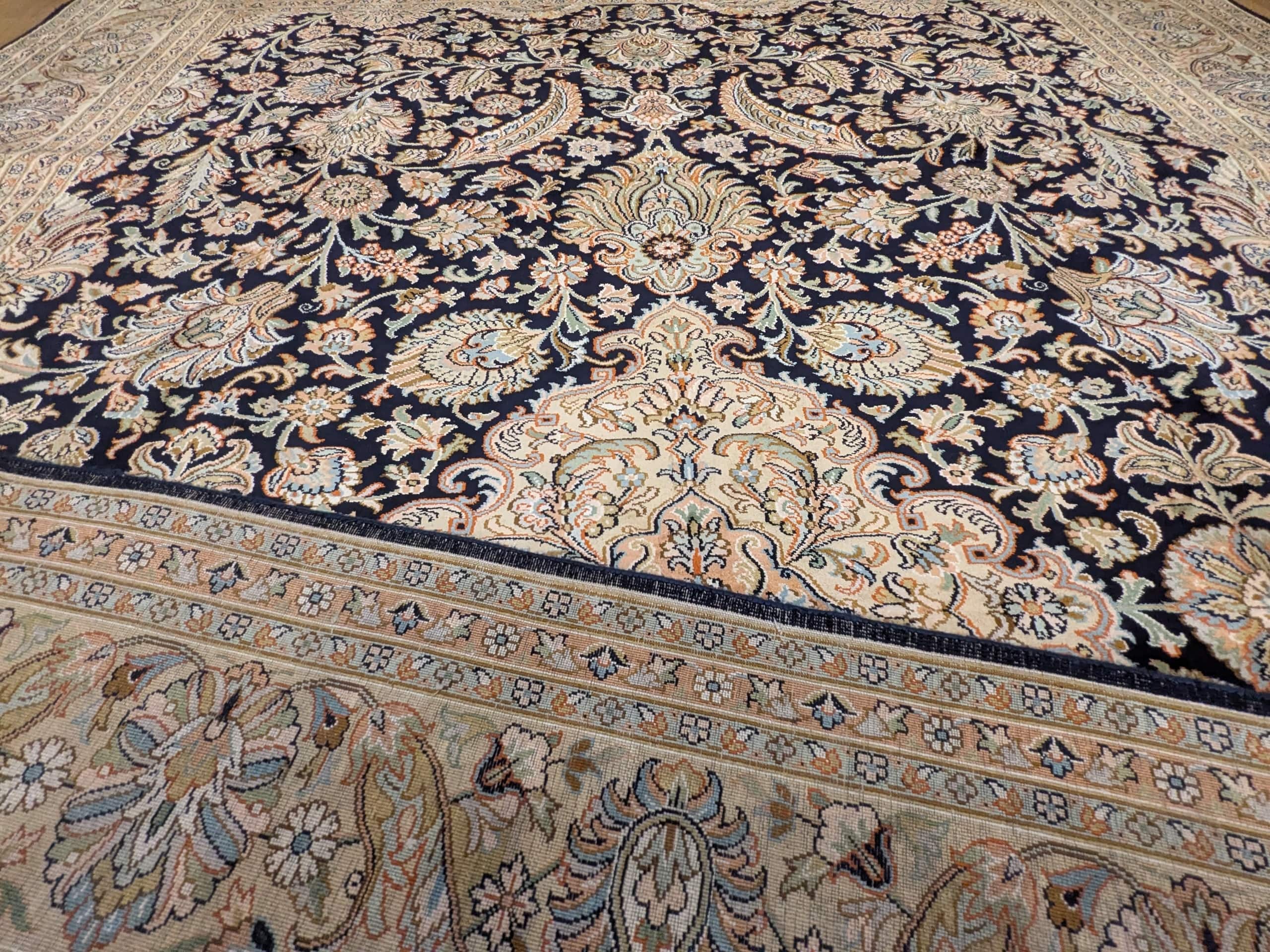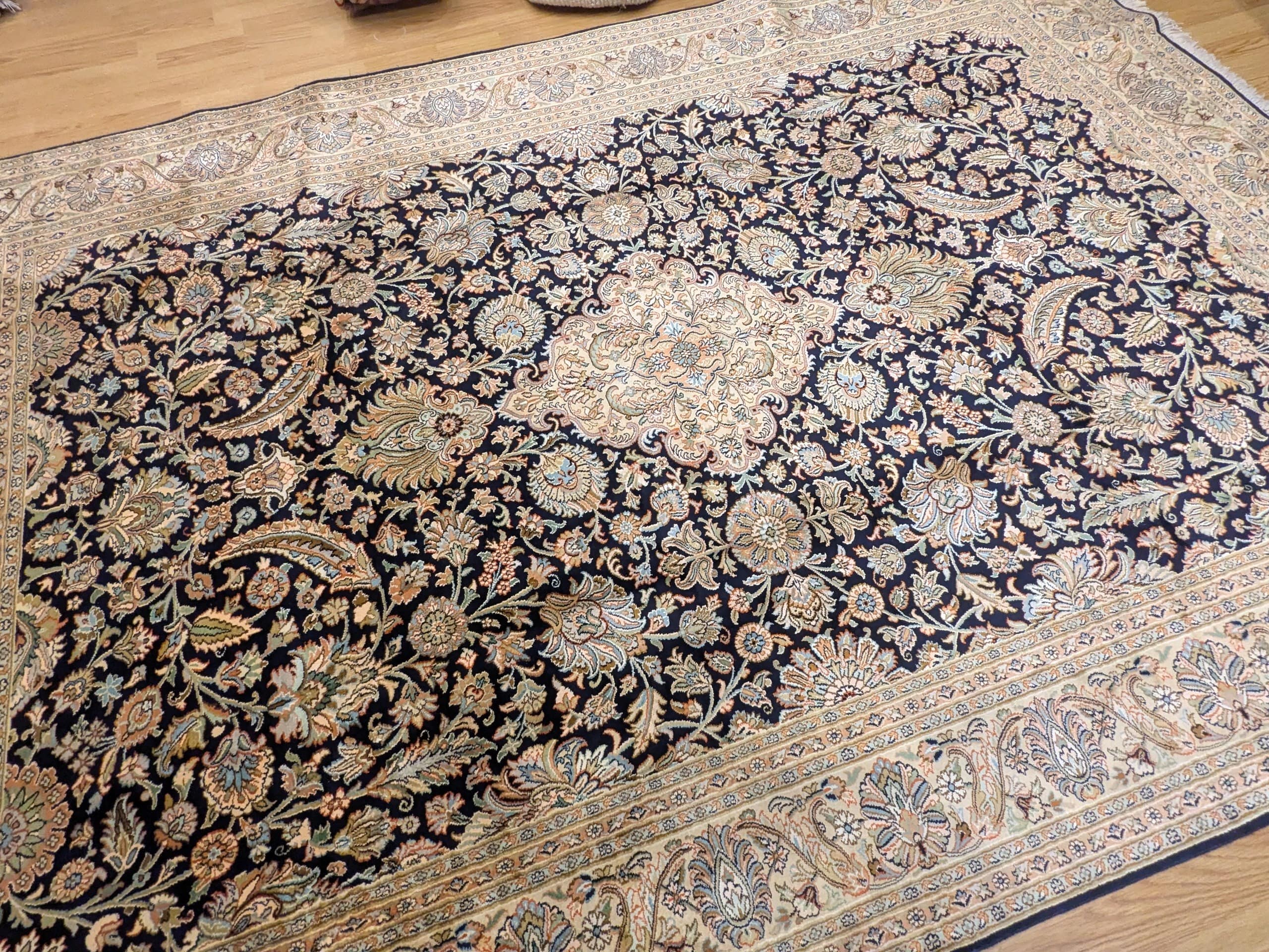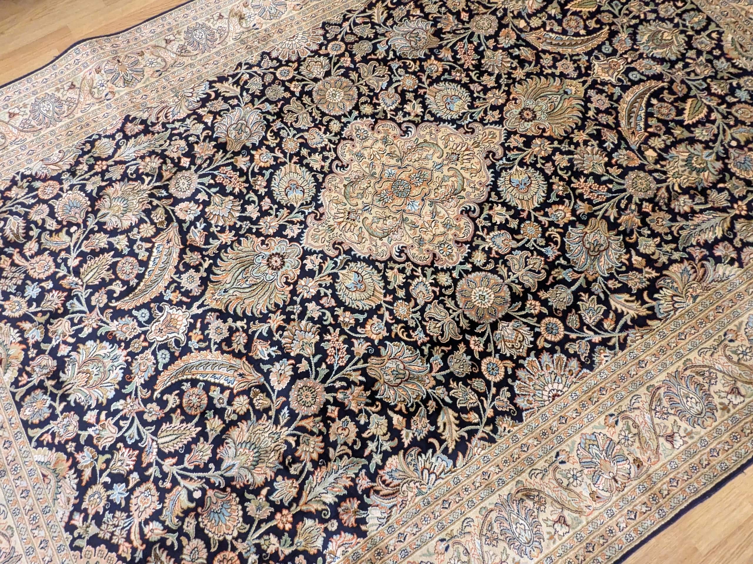 Ce tapis Cachemire, noué main en Inde, incarne l’excellence des traditions textiles du nord du sous-continent. Sur un fond noir profond, il déploie une composition florale foisonnante, dominée par un médaillon central délicatement orné. Un travail raffiné qui révèle tout le prestige de l’artisanat cachemiri.