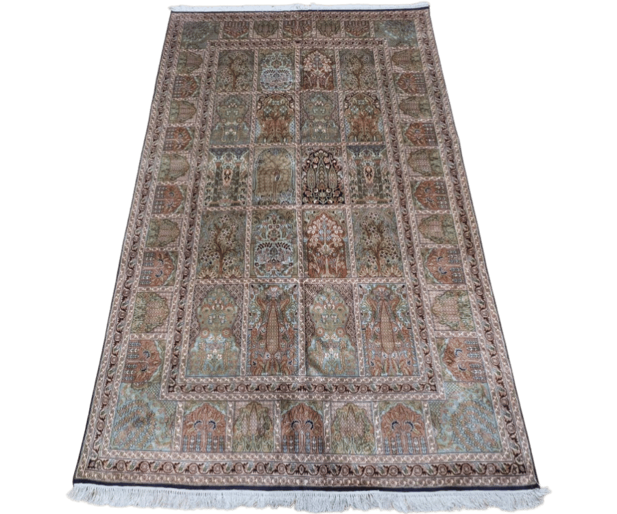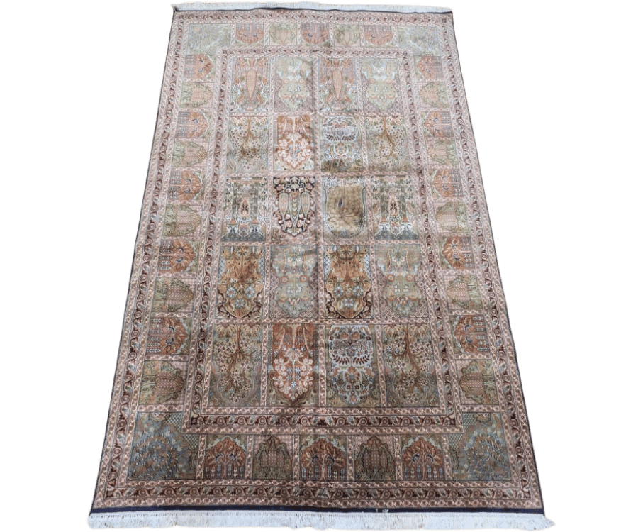 Ce tapis noué main au Cachemire est un hommage à l’élégance intemporelle du style 4 Saisons. Sur un champ vert clair aux nuances subtiles, se déploient des panneaux richement décorés de motifs floraux et végétaux. Chaque case est pensée comme une miniature ornementale, apportant rythme et raffinement à l’ensemble. Sa composition équilibrée et ses couleurs fraîches lui permettent de s’intégrer avec grâce dans des intérieurs lumineux et délicats.